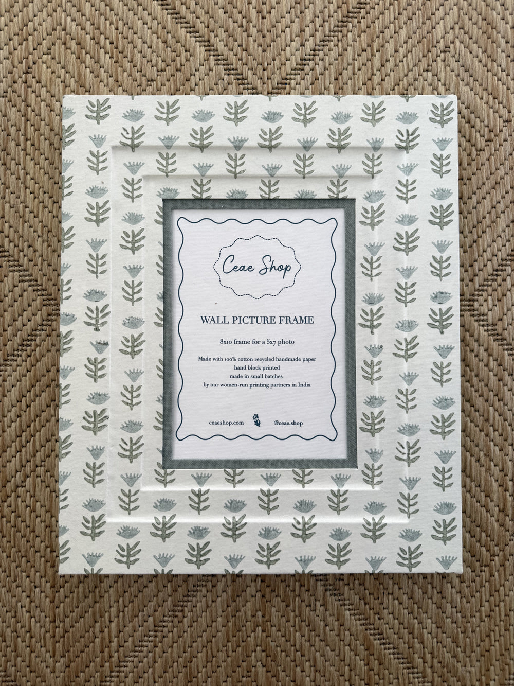 Our picture frames are made of recycled cotton paper that is hand block printed, then wrapped by Master Artisans in India. The overall frame size is 8x10 and holds a 5x7 photo.