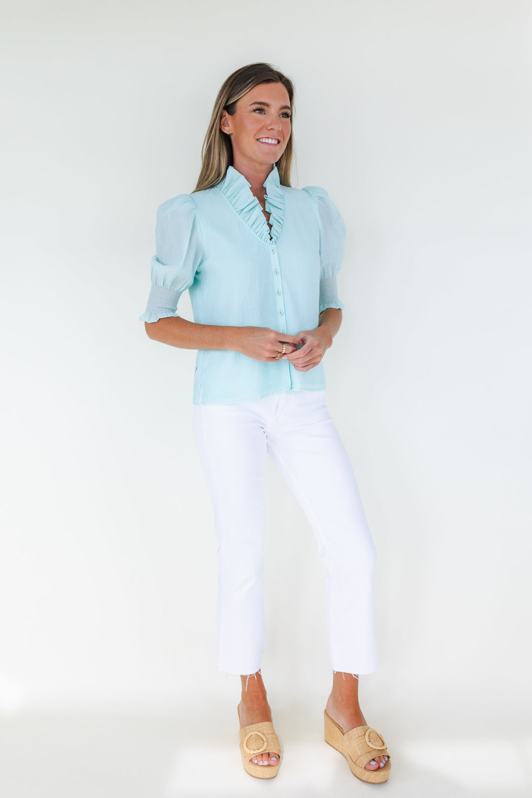 The Harper Top, a striking blend of modern design and vintage flair. Made from unique nylon crinkle fabric, this top showcases a textured look that adds depth and interest to any ensemble. The Harper Top features statement puff sleeves and a chic stand-up collar, combining contemporary trends with classic elements.