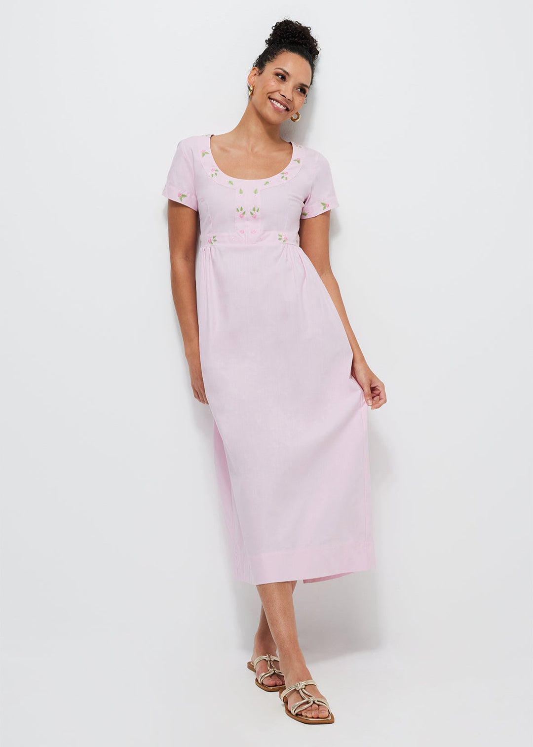Effortlessly elegant and timelessly feminine, this midi dress blends intricate floral embroidery with a structured yet soft silhouette. Designed for comfort and style, it’s a versatile piece perfect for any occasion.