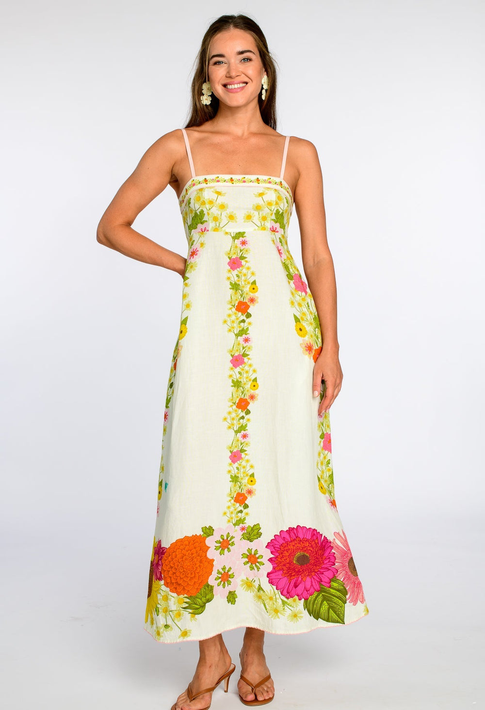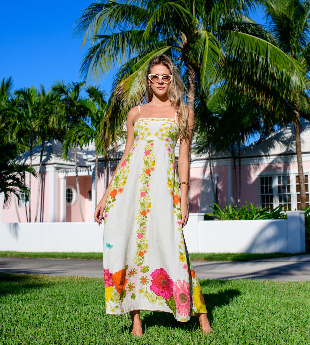 With her fitted empire bodice and flattering paneled skirt, Annalisa is a new favorite silhouette. She looks especially chic in this gorgeous Wildflower Ivory print, elevated with decorative trim and pink piping details. Adjustable straps and a smocked back offer a comfortable fit for the perfect summer midi dress.