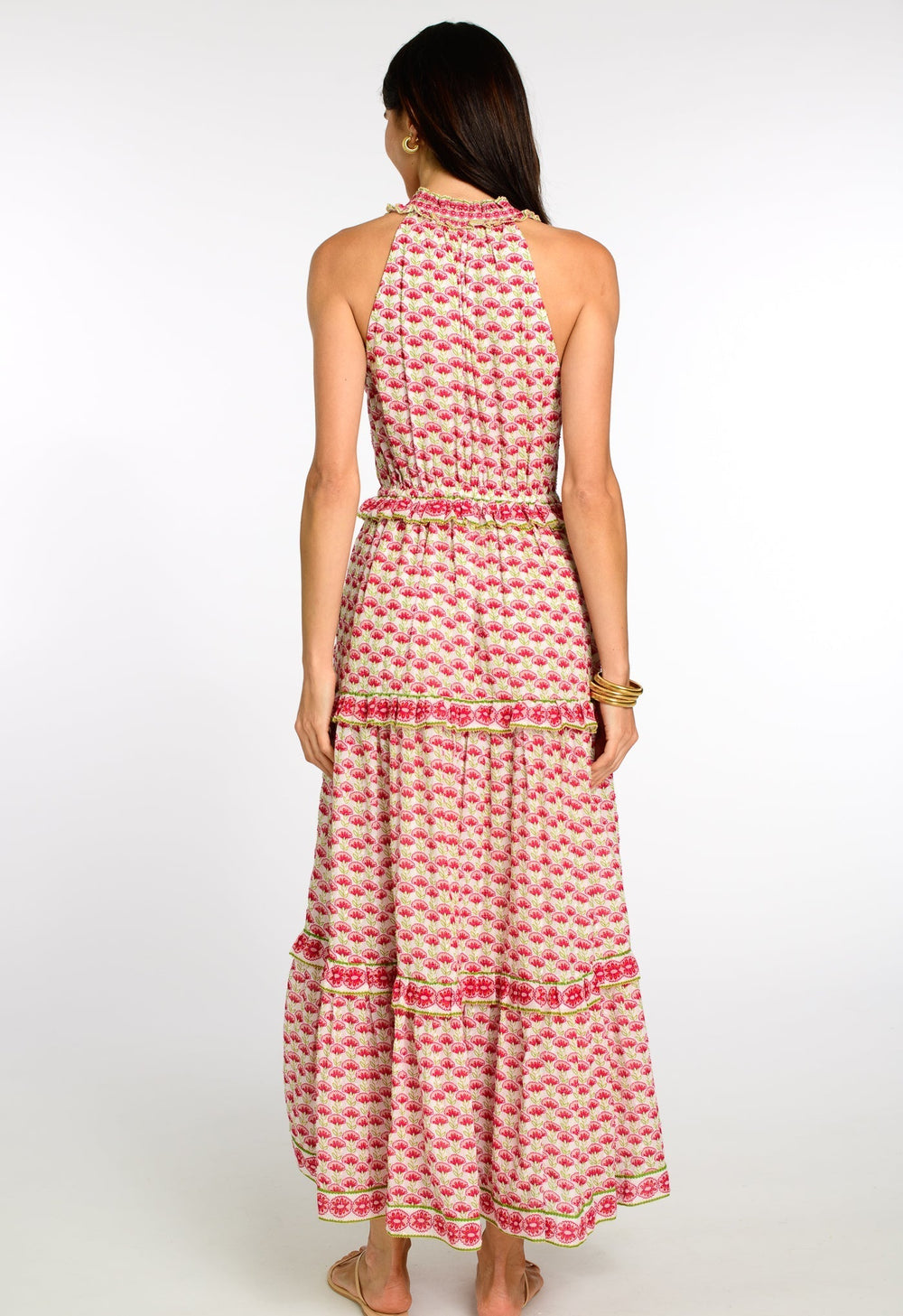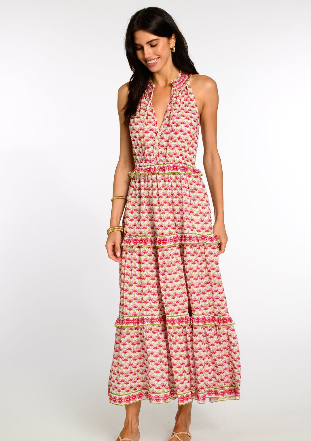 Ava is an easy, elastic waist silhouette featuring a drawstring neckline with ties that can be worn loose or tied in a bow. Contrast trim and ruffles highlight the tiers of this pretty pink floral print. And a breezy, Swiss Dot cotton fabric makes Ava perfect for Spring and Summer wear.