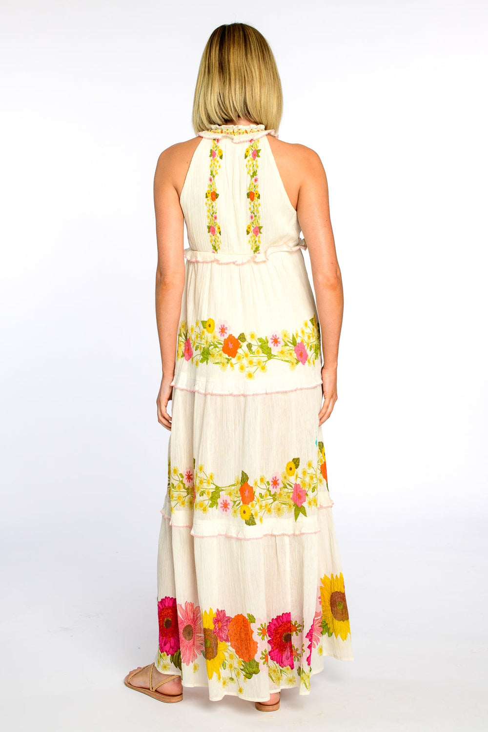 Ava is an easy, elastic waist silhouette featuring a drawstring neckline with ties that can be worn loose or tied in a bow. Contrast trim and ruffles highlight the tiers of this pretty Wildflower print. And the breezy crepe fabric makes Ava the perfect piece for Summer wear.