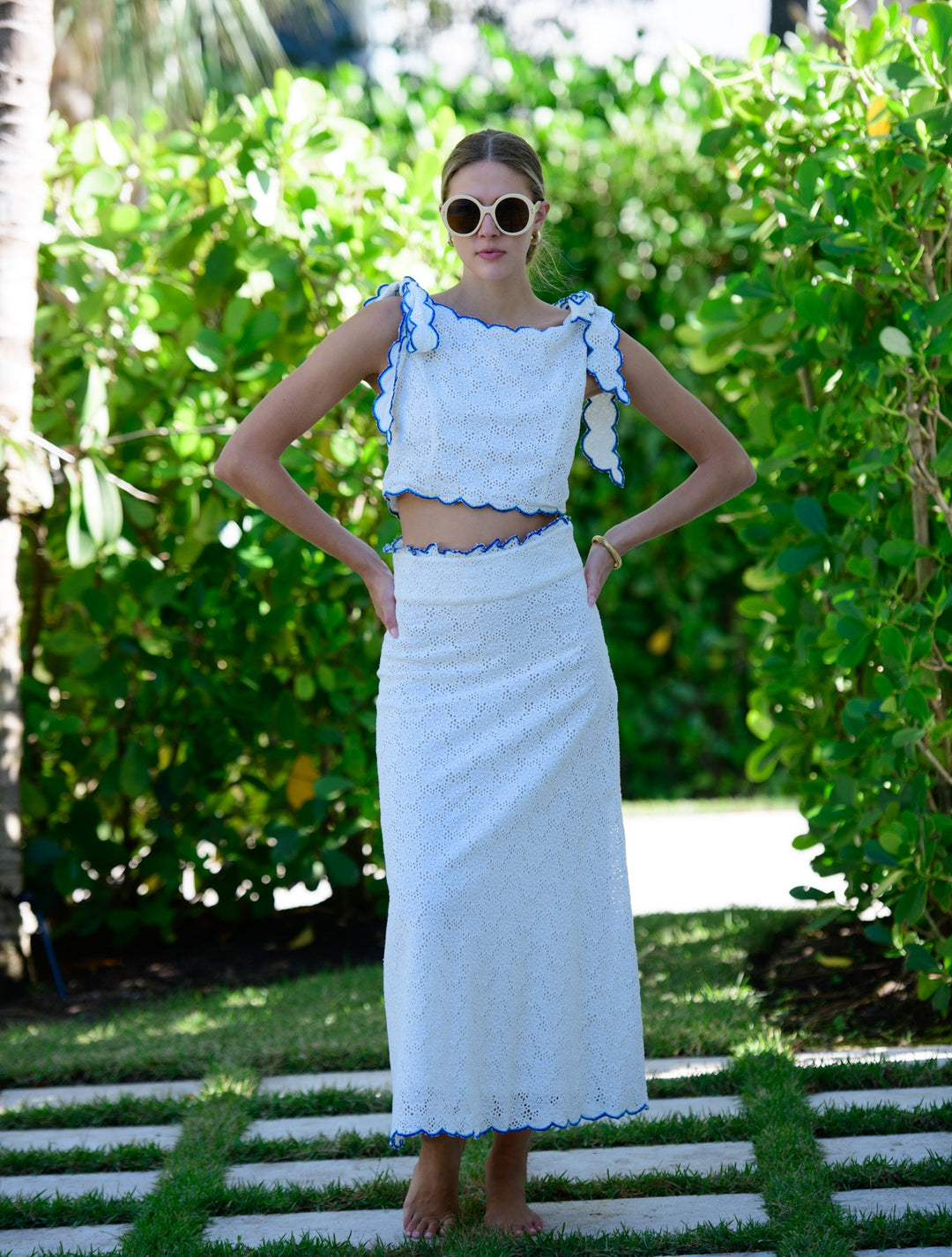 Our Billy Top is perfect for the summer season in a white floral eyelet with blue scallop embroidery. We lover her worn as a set, but she pairs just as nicely with all your favorite printed or solid skirts and shorts.