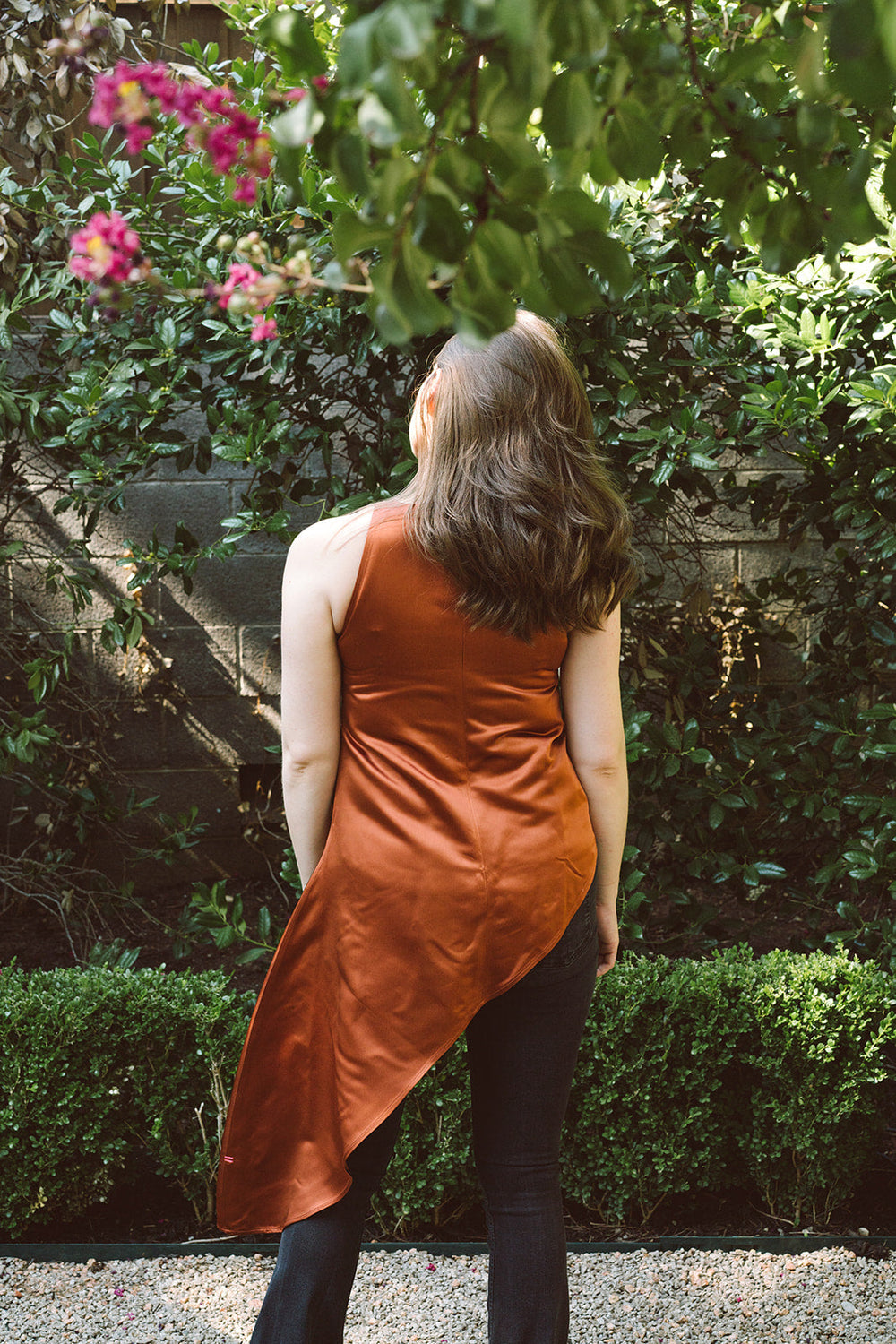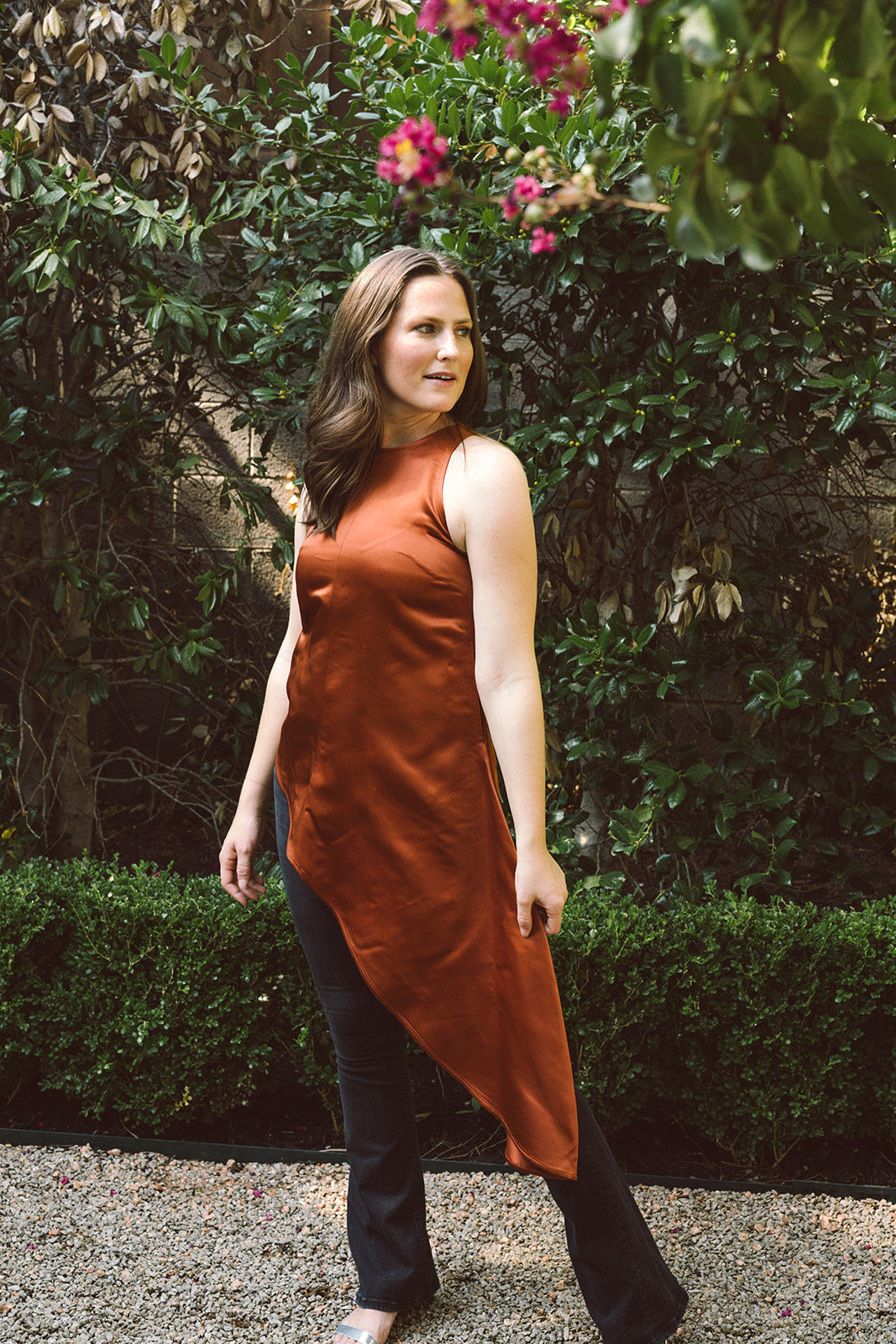 This rust tunic with an asymmetrical detail is perfect for fall. Pair it with jeans and boots for the perfect autumn look.