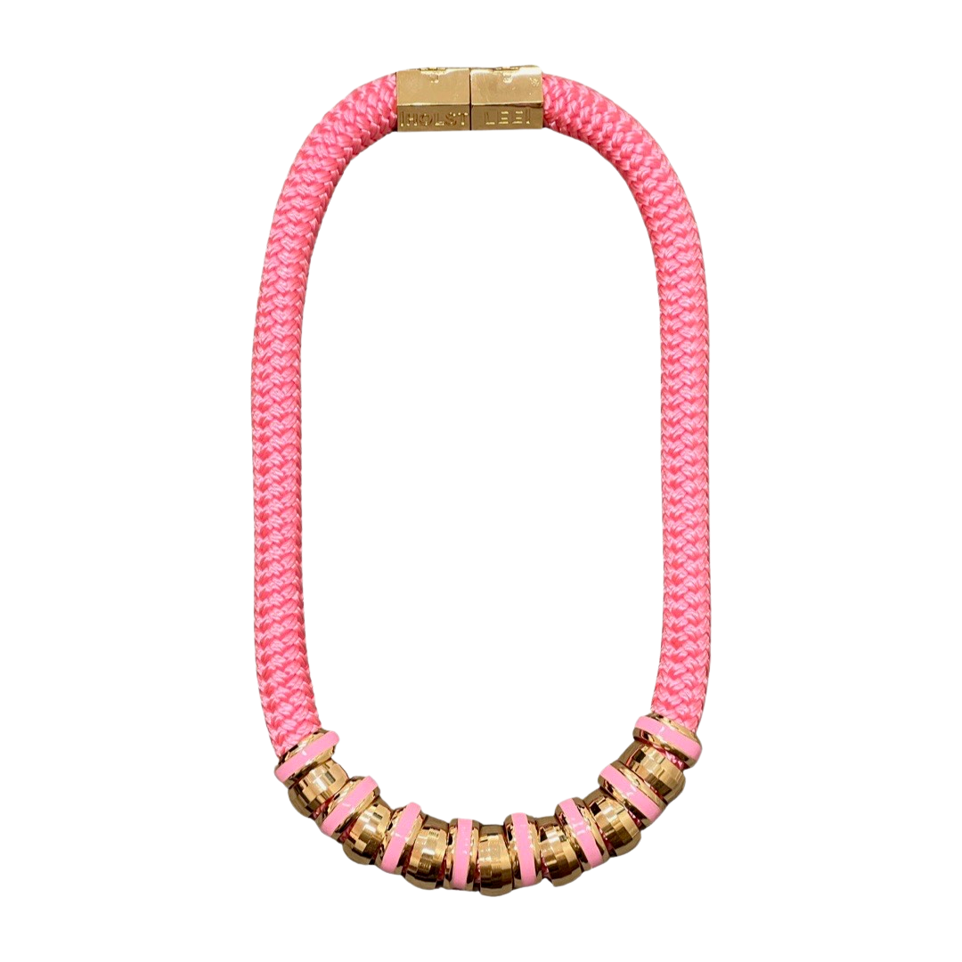 This mixed fabric necklace features brass fixtures. Embossed logo lettering at magnetic closure.
