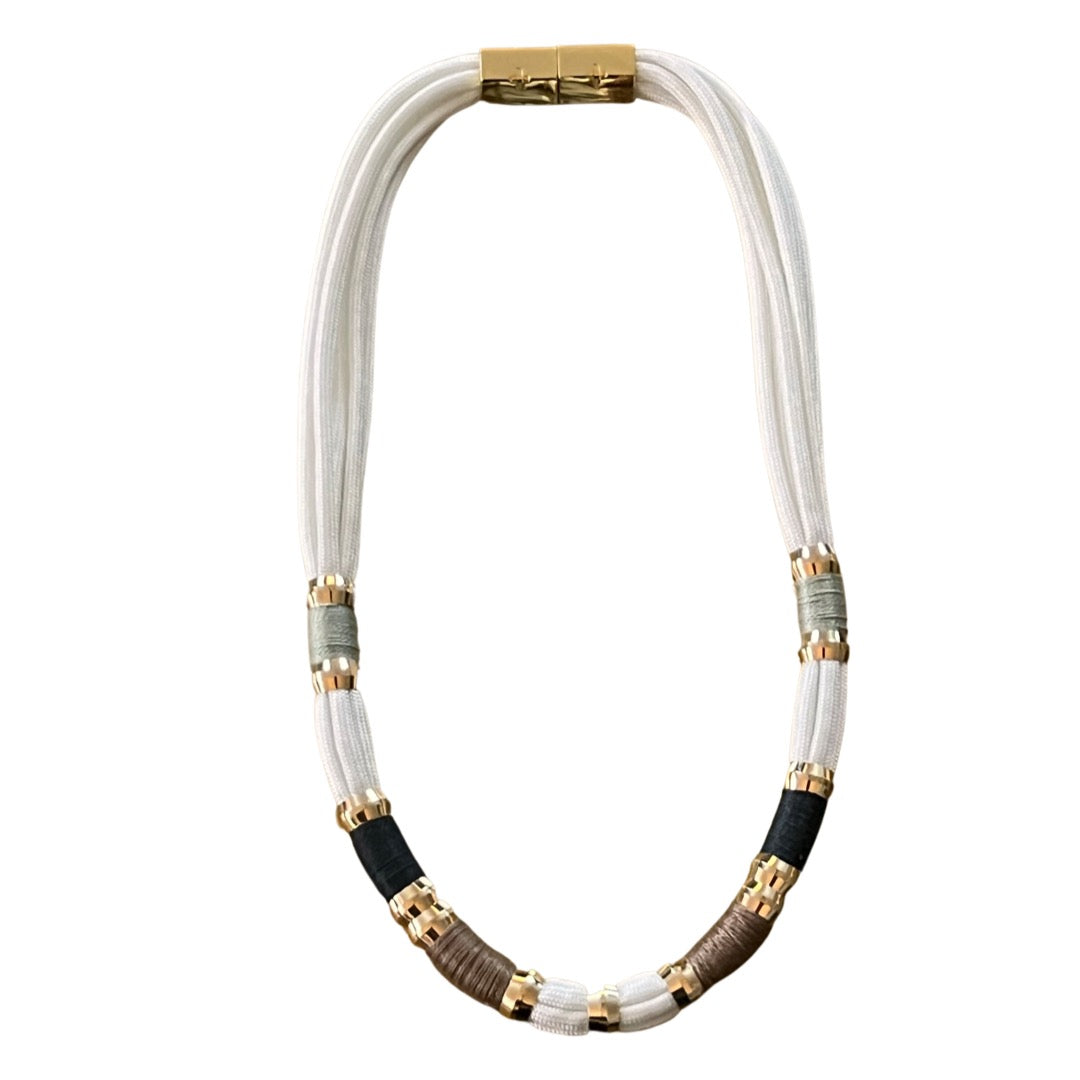 Paracord, Gold-Plated Brass Parts, Pearl Cotton Thread, Signature Magnetic Clasp.