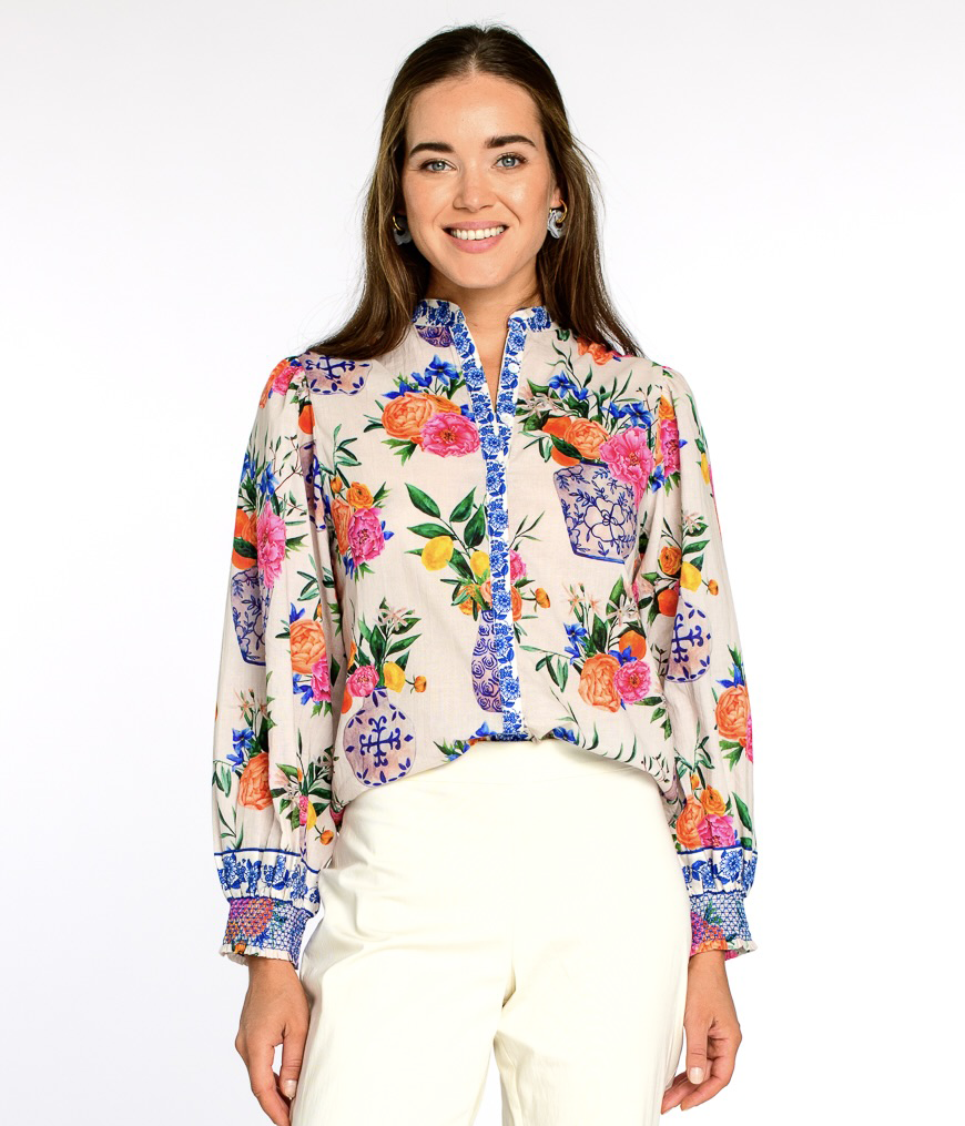 Cut from a light cotton blend fabric, the Emily Top in Ivory Ginger Jars is the perfect button-down to dress up or down this season. She features a mandarin collar, covered placket, balloon sleeves, and a decorative border trim.