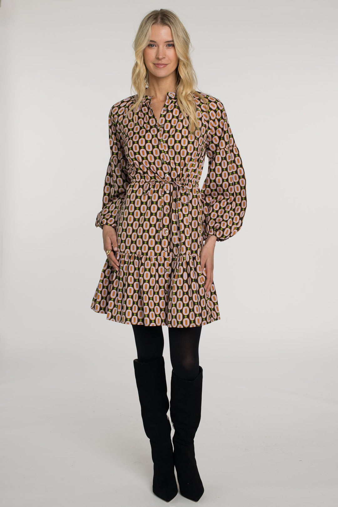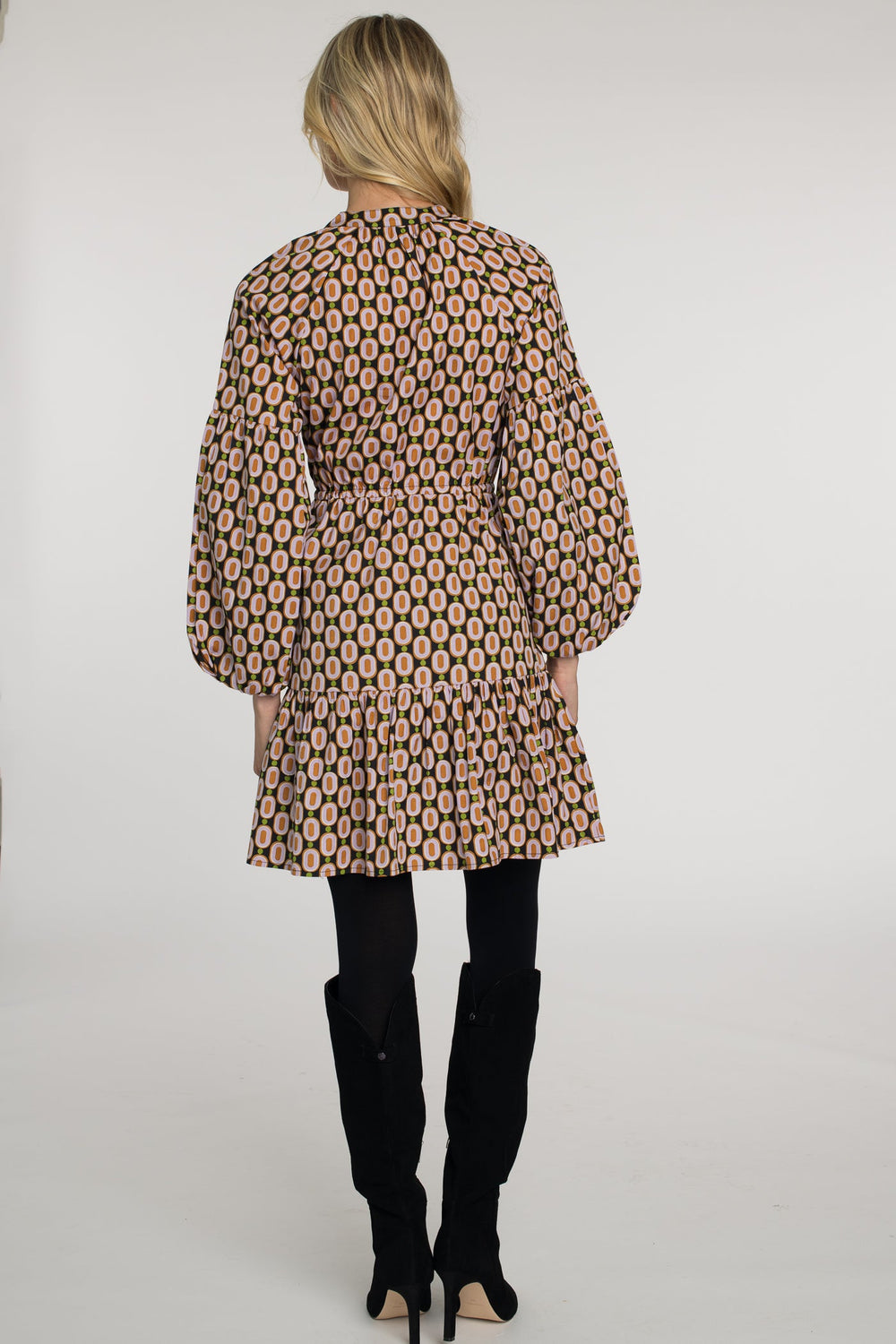 Our popular Emory style has been updated this season in a mini length, drawstring waist dress. Her dramatic elastic cuff balloon sleeves can be worn long or pushed up for a 3/4 length look. This retro inspired mini link print is seasonless and easy to style with a variety of footwear options, from leather to suede.