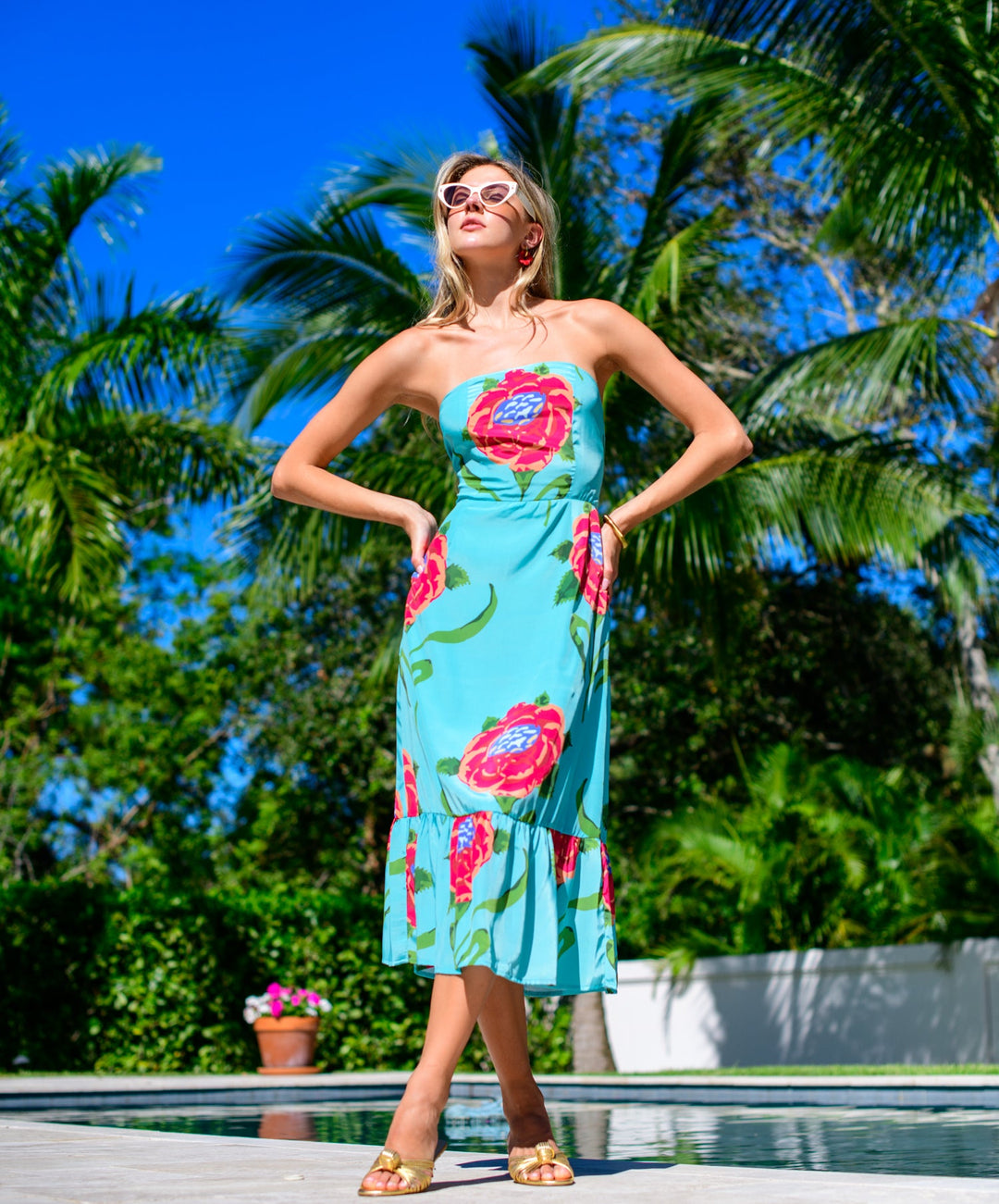 Meet Grace -- a pretty, strapless silhouette with a flirty peplum hem that is perfect for dancing. Cut from a luxurious silky crepe, she makes a statement in our Large Roses print and is the perfect dress for all the parties on your calendar this season. Pair her with our Honey Cardigan for chilly nights.