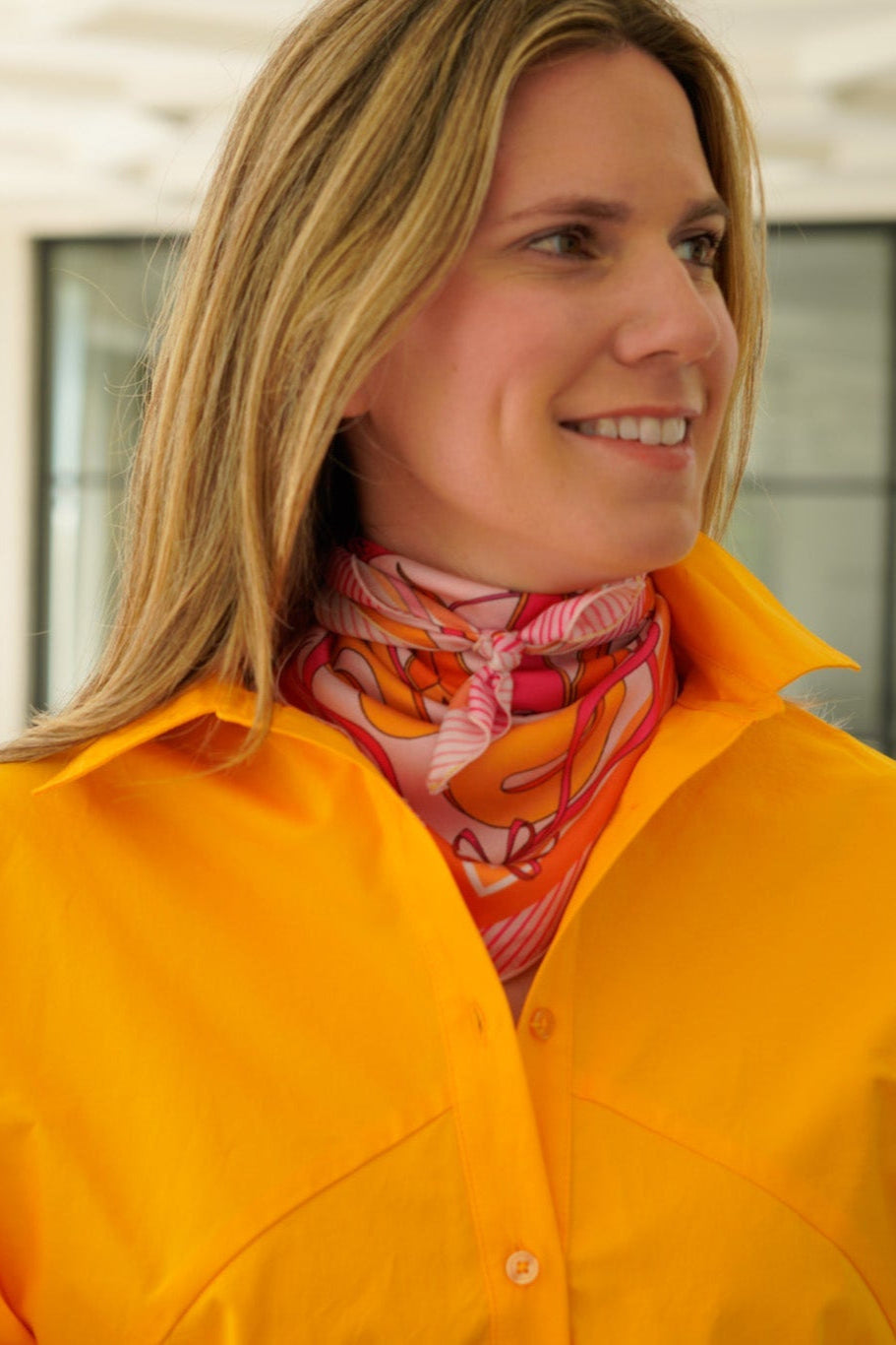 This Havana scarf comes in shades of pink and tangerine orange, making it the ideal accessory for any summer outfit. Crafted from luxurious silk, this scarf is inspired by the vibrant hues of Havana, Cuba, and is a playful addition to any ensemble.