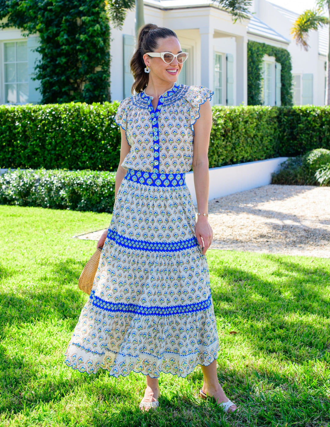 The Kate Top is beautifully crafted in an airy cotton fabric with printed eyelet flutter sleeves. Featuring contrast trim, decorative smocking, and embroidery details throughout, she is hand craftsmanship at its best.