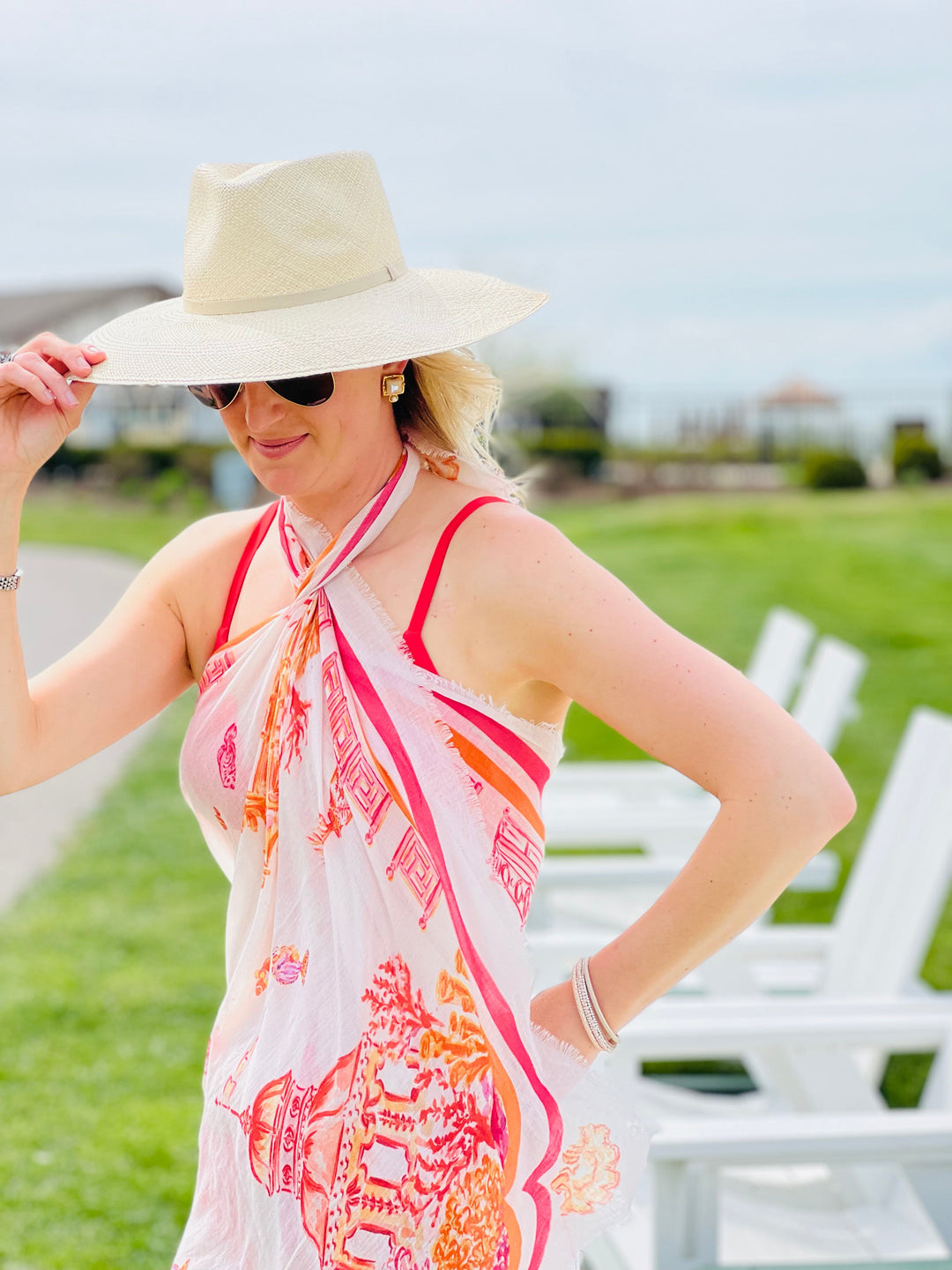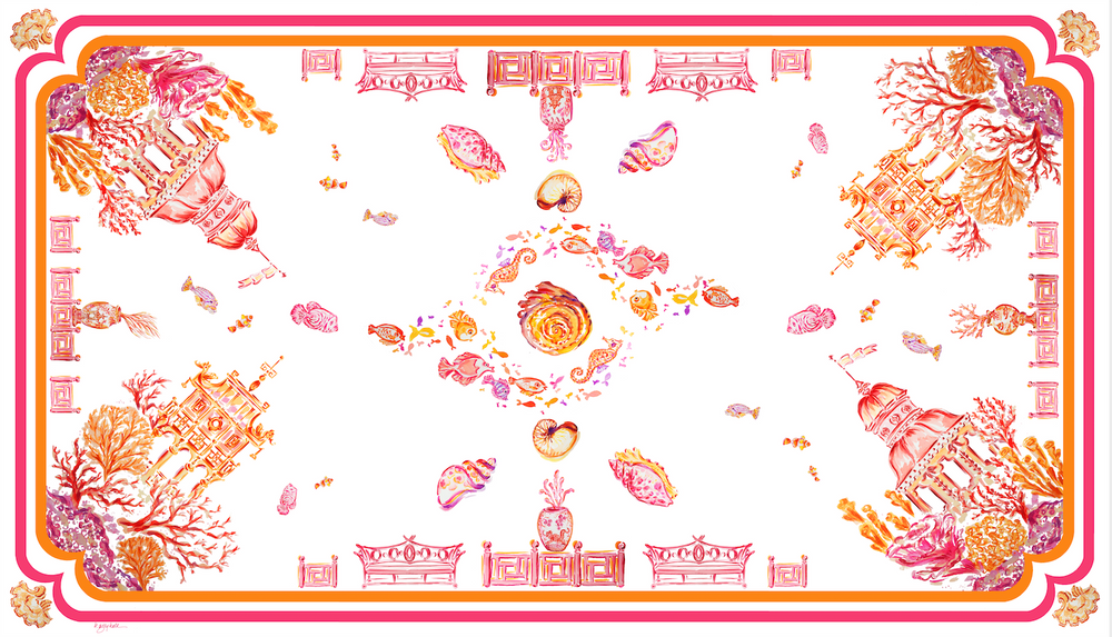 Whimsical pagodas nested among coral under the sea create this imaginative utopia. A Chinoiserie fairytale is the story told on a gorgeous white silk backdrop. The pink and orange border forms hearts at each corner with the added detail of a painterly shell for a tailored finishing touch. Original watercolor artwork translated to a luxury silk scarf with hand-rolled edge beautifully accented in pink.