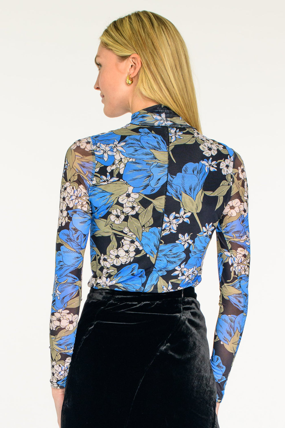 New this season is our mock turtleneck Samantha top in stretch mesh. She is perfect to tuck into your favorite skirts or trousers, and she looks great layered under a jacket or vest.