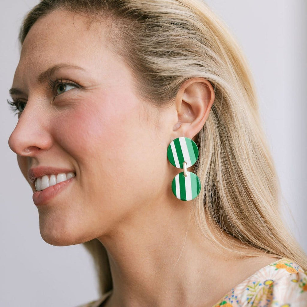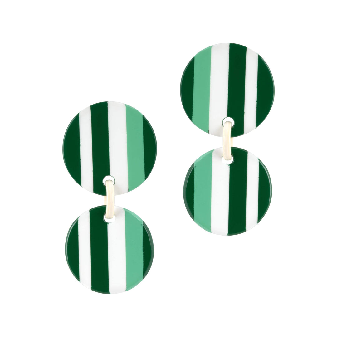 The Seagrass Double Dangles stand out with their lively green and white stripes, designed in a playful double-circle shape. These earrings are lightweight and eye-catching, perfect for adding a fresh and bold accent to your style.