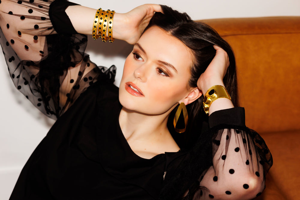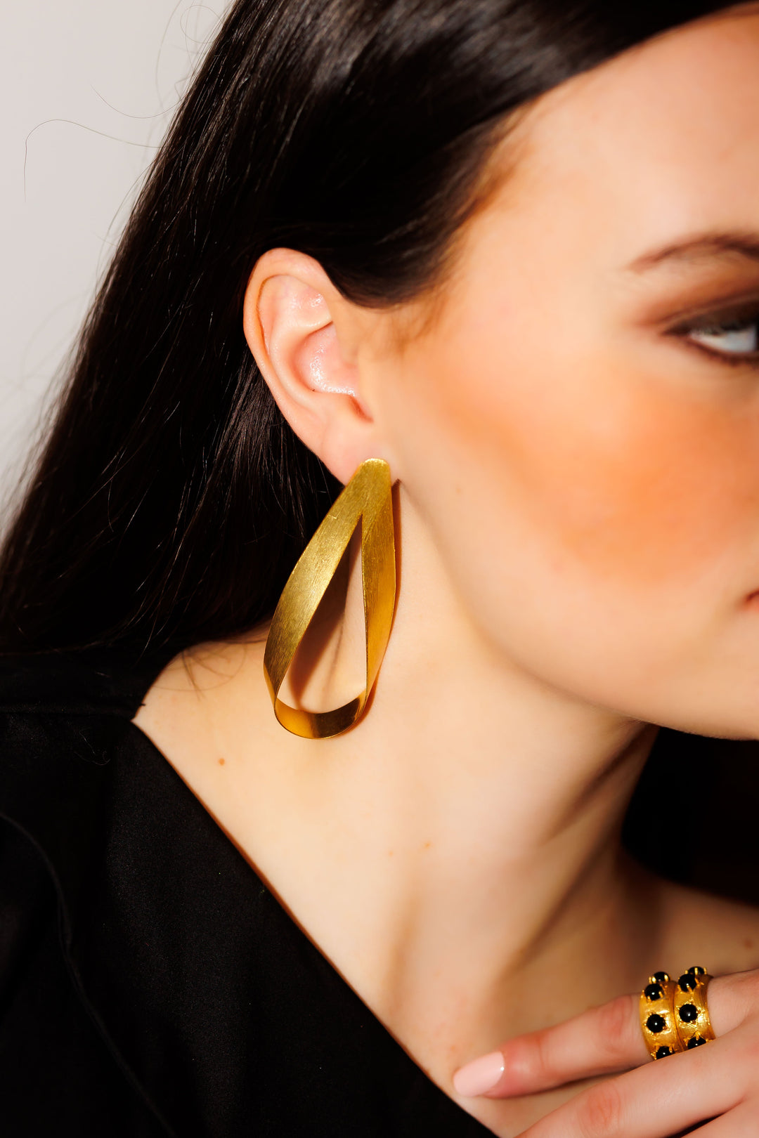We are in love with this unique gold hoop, with the essence of a ribbon look! This triple brushed 22k gold hoop is back for her third time in our collection! The Bella hoop is 3 inches in length from top to bottom. For a smaller look with equivalent elegance, we offer The Bella hoop in a petite version!