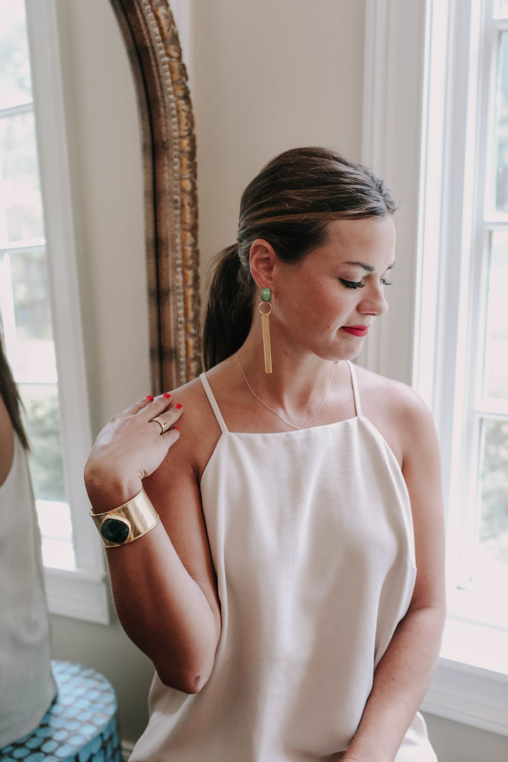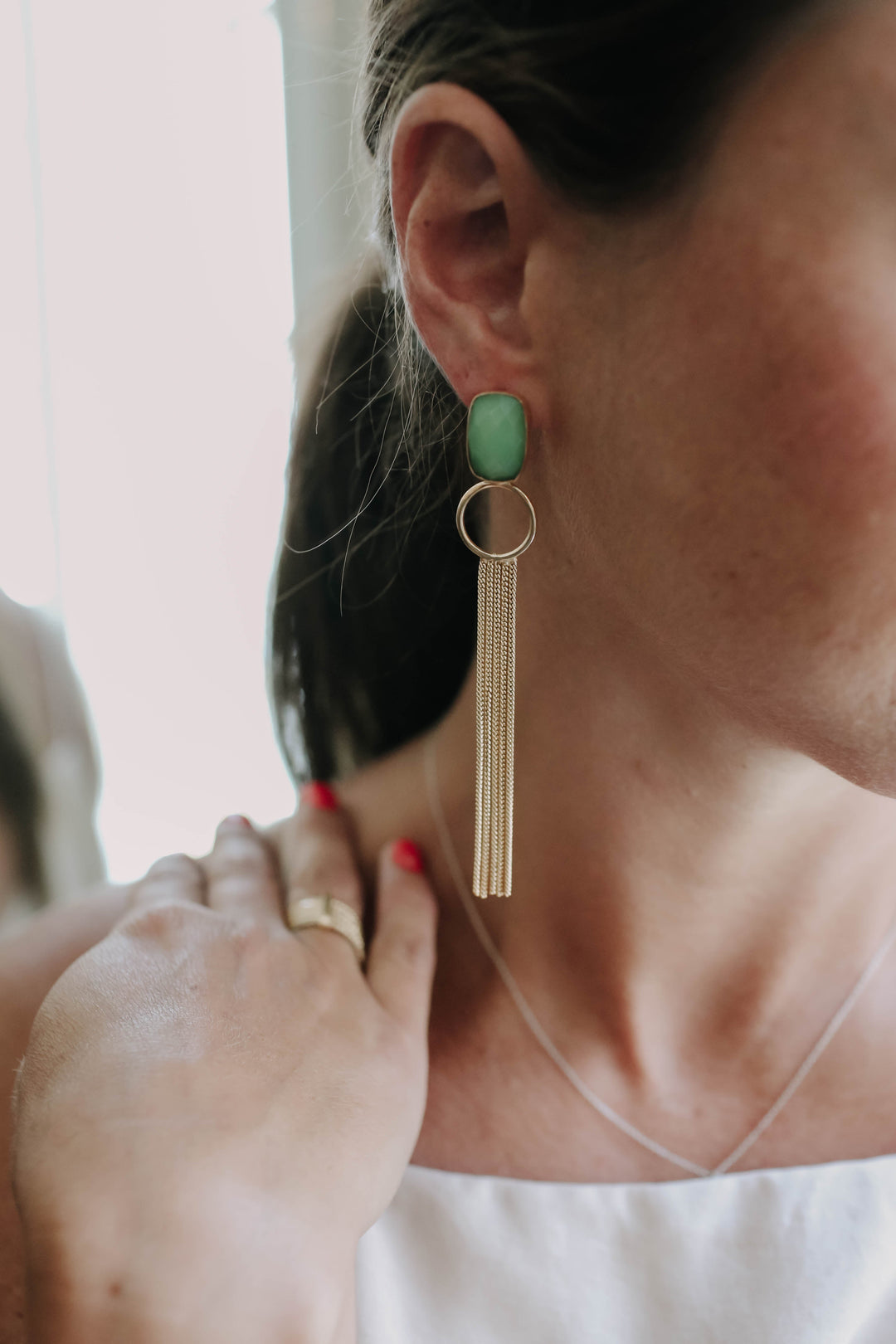 The vibrant earring is made with a beautiful beveled cut chalcedony stone and 22K gold plated tassels. With 3.5 Inches from top to bottom, you’ll love how lightweight and comfortable this pair is! The movement from the tassels will be daring heads to turn!