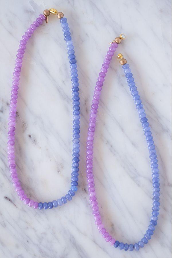 Introducing the Vienna Necklace, a beautiful duo-toned necklace handmade with purple and blue gemstone like glass beads. This beaded necklace is so cute layered with your everyday necklaces or worn on its own, she might be your new favorite necklace! Our necklaces are handmade in Charleston, South Carolina, is stretchy, and features a magnetic clasp, there's no clasp to fidget with. Regularly clean the surface of the magnets with a soft cloth to preserve the strength of the magnetic clasp. Necklace Length: 18 inches. This listing is for one item, pictured on the far left of the image.