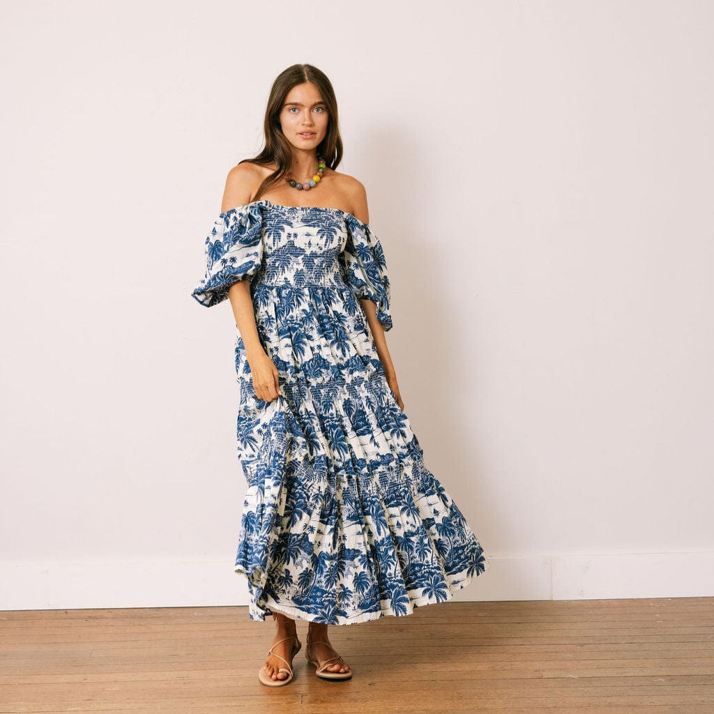 The Tropical Toile Tula Dress features a stunning navy and white palm print with a smocked bodice and tiered silhouette for a flattering fit. Designed with puff sleeves, this dress is perfect for both casual beach days and elevated summer soirées.