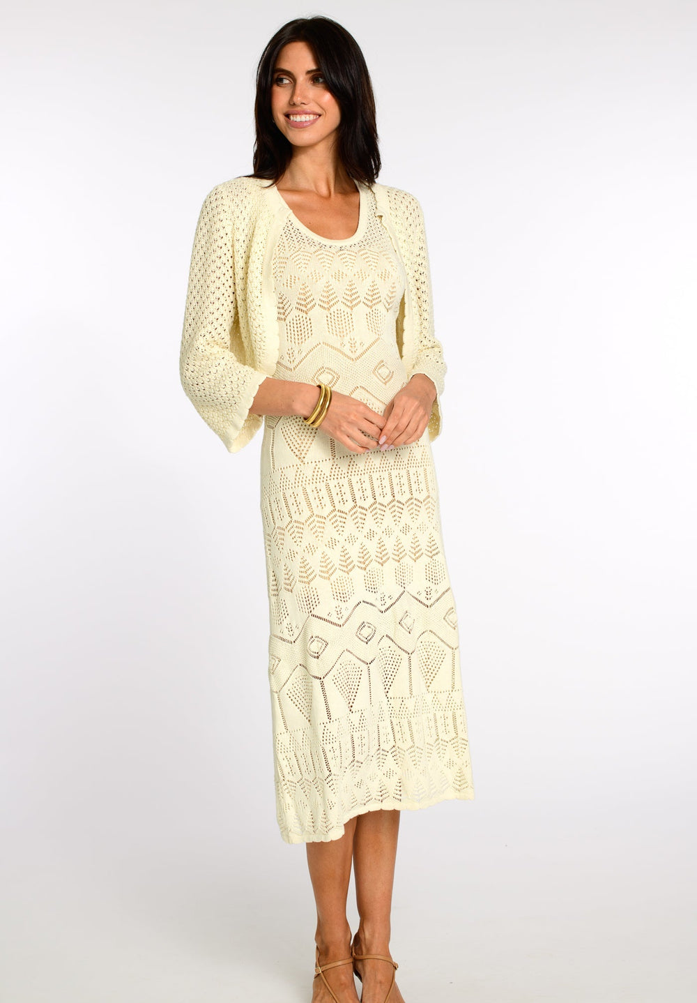 With a scoop neck that can be worn front or back, our sleeveless Willow Sweater Dress is made from a super soft yarn and has a unique geometric woven pattern. We love her layered under a jacket or our Honey Cardigan.
