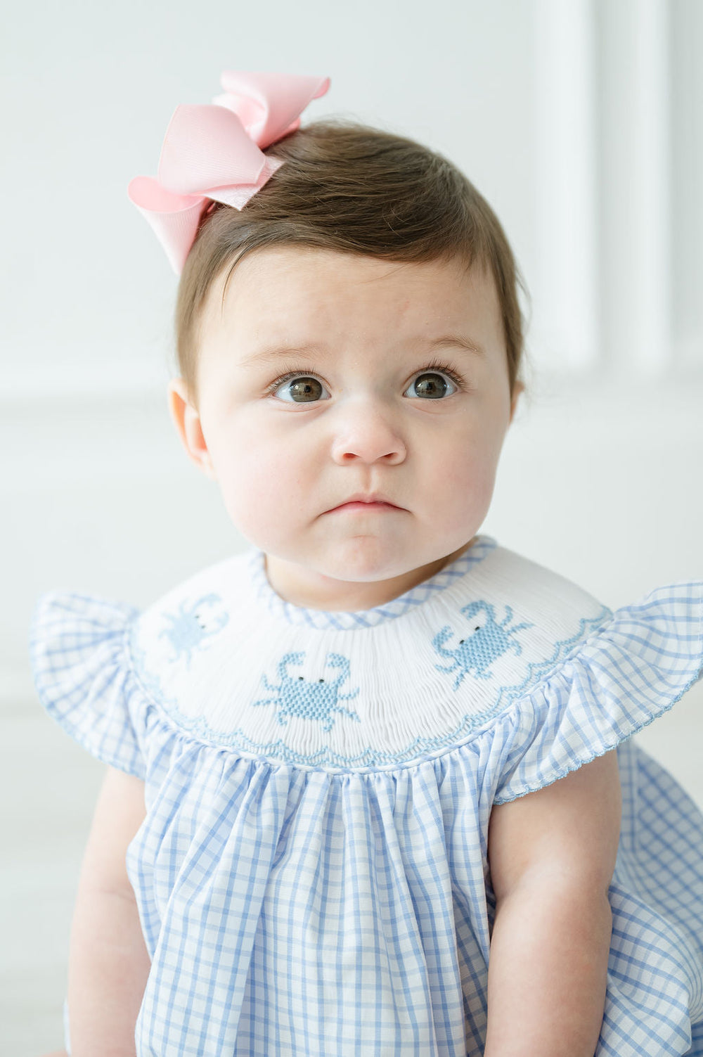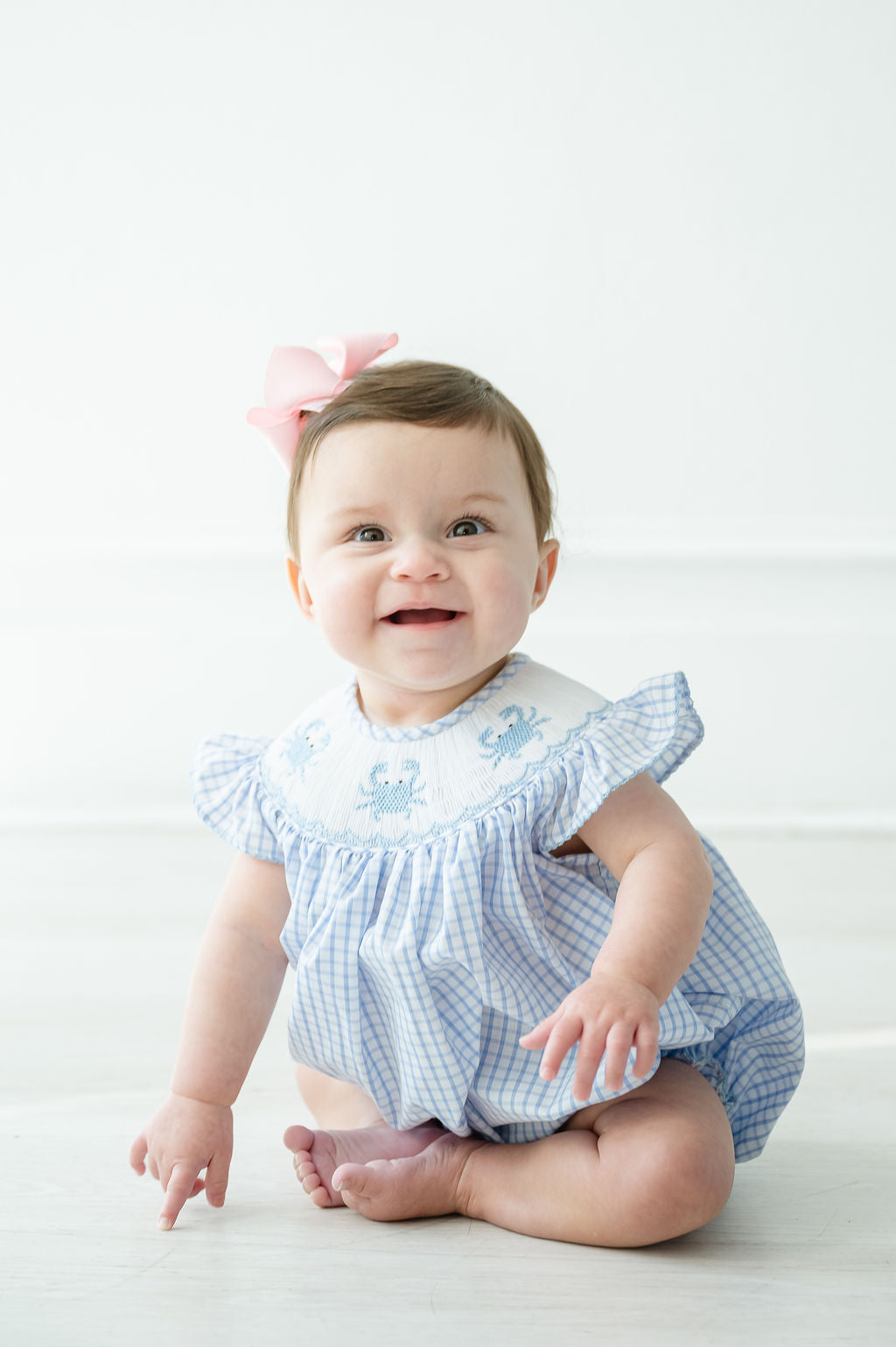 The Smocked Crab Bubble features hand-smocked crabs in blue on a soft light blue and white check fabric, making it perfect for beach trips, crab boils, and sunny summer vacations. This heirloom-quality bubble combines charming details with comfort and style. Made from a soft 65% polyester/35% cotton blend, it’s designed to last through all of your little one’s summer adventures. Available in sizes 3M to 2T for babies and toddlers, it’s the perfect choice for family gatherings and warm-weather fun.