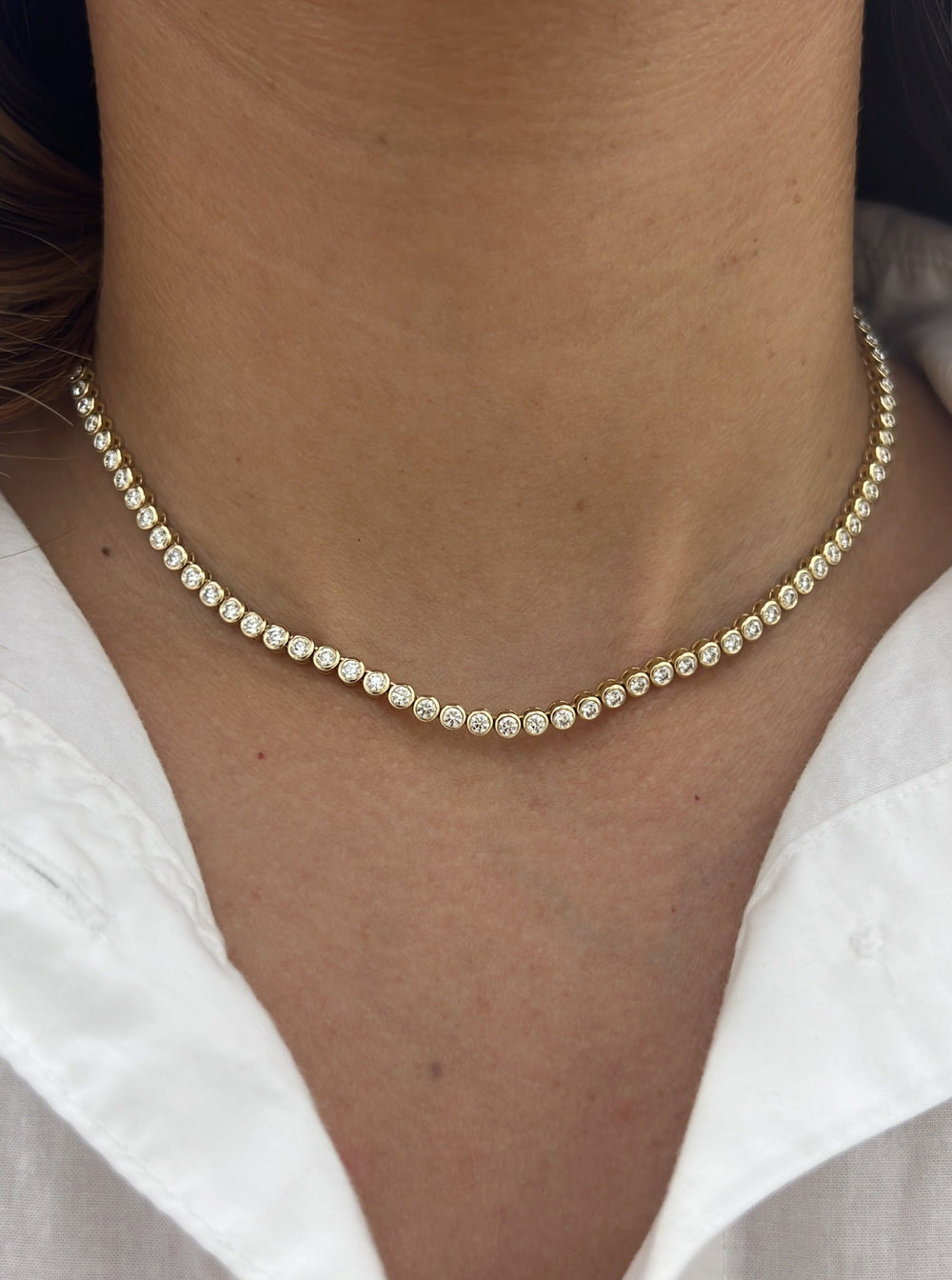 A classic tennis necklace for any occasion. This 3.50 ct of diamonds are bezel set on our classic Tennis Choker chain for an adjustable style. The perfect piece to start layering!