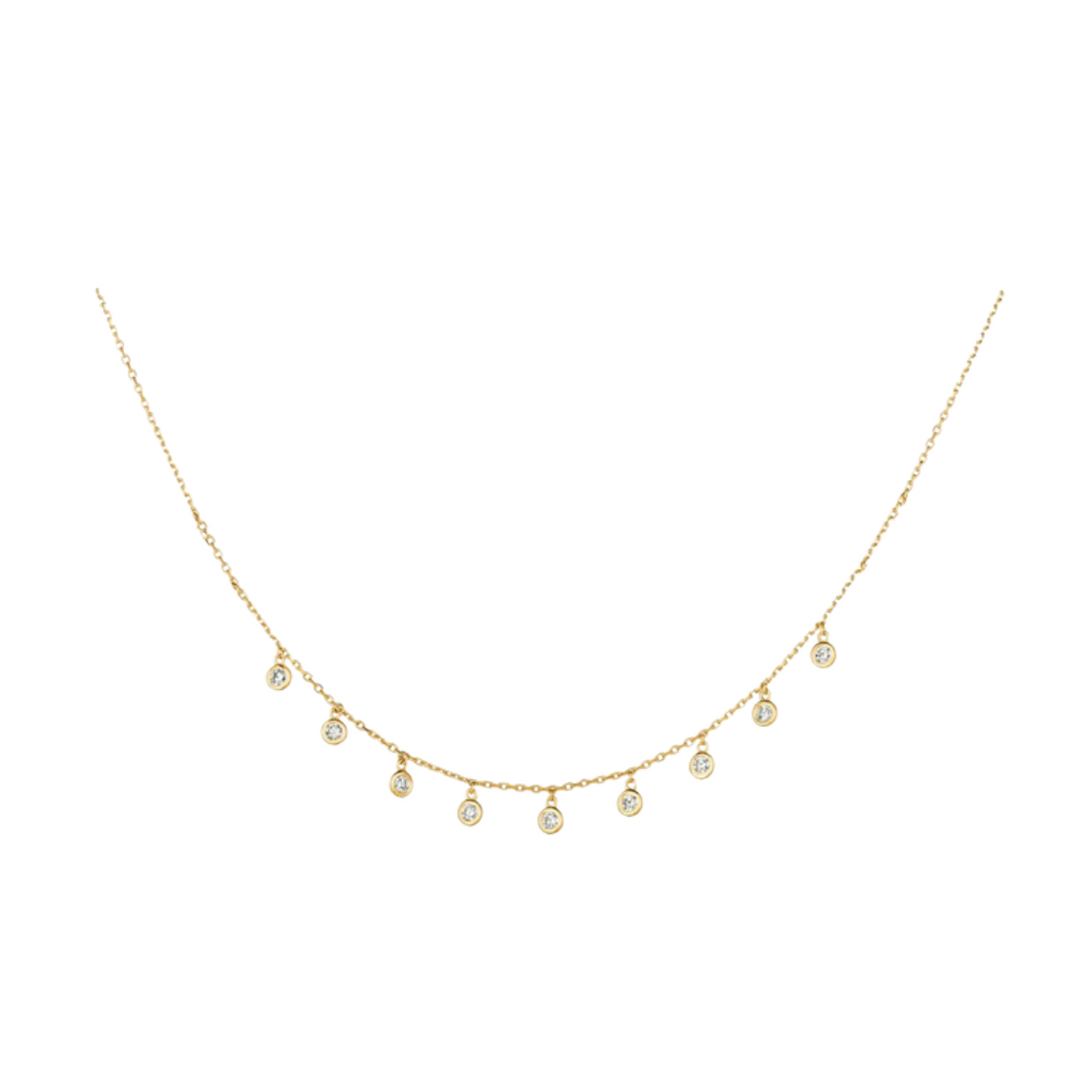 A reinvented diamonds by the yard, our signature Diamond Drop Station necklace is 9 clear full cut diamonds bezel set onto a 14K link chain. Each necklace is complimented with a diamond bezel crown pendant. A layering piece that makes everyday a special occasion.
