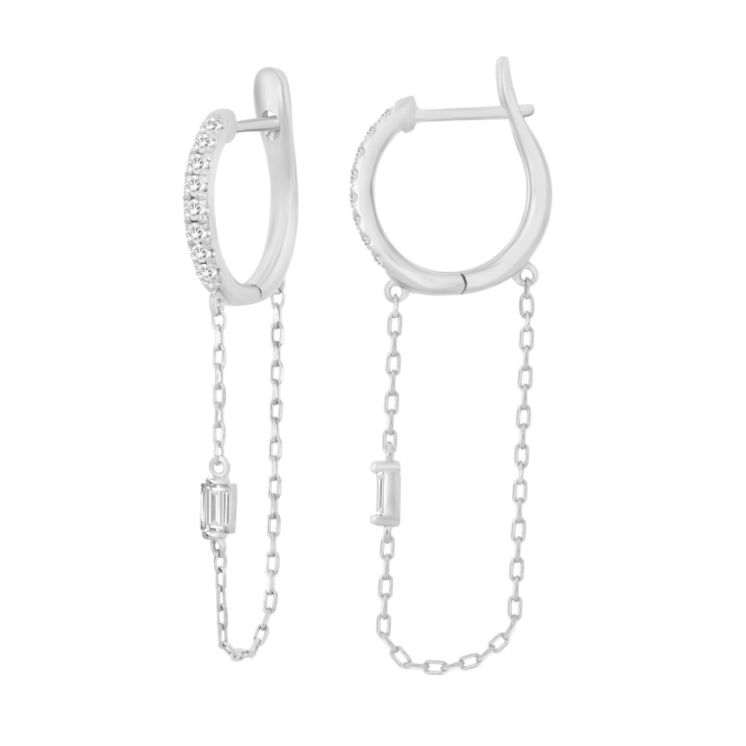 Iconic slim hoops go to dramatic lengths with a single emerald diamond securely placed in the middle of the chain drop. This delicate addition will bring your earring stack to new lengths.