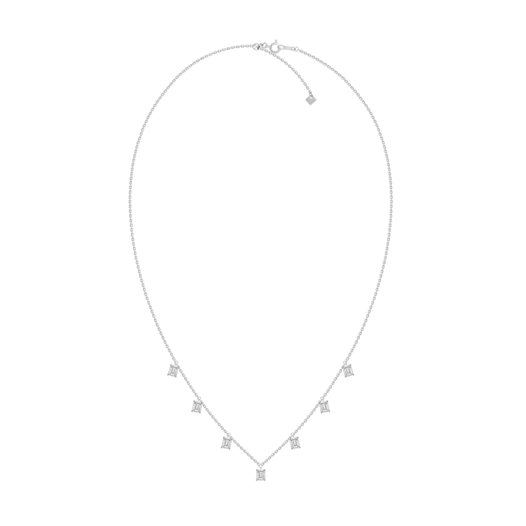A twist on our core collection piece- our Emerald Diamond Drop Station necklace is 18-karat gold fixed to an 18-inch delicate chain accompanied by 7 clear full cut diamonds. Each necklace is complimented with a diamond bezel crown pendant and bolo tie adjustable closure to wear as a choker or at the base of the neck.