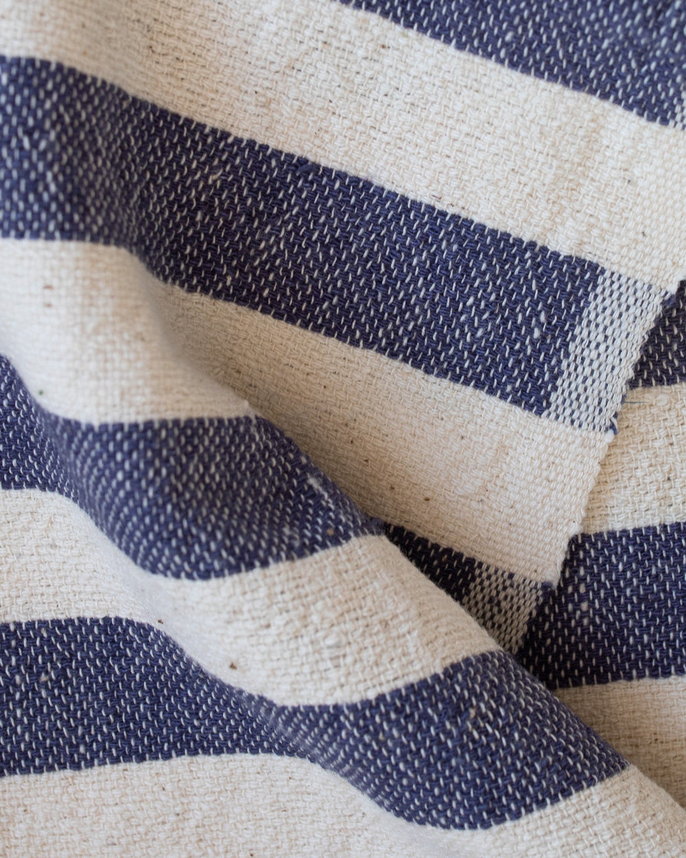 Our large, 100% organic cotton indigo stripe towel has been spun, dyed (AZO free), woven, & sewn by our artisan partners. These multifunctional towels are 28" x 56" with a wide 1 inch horizontal natural stripe.