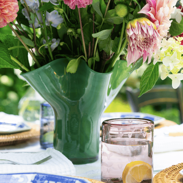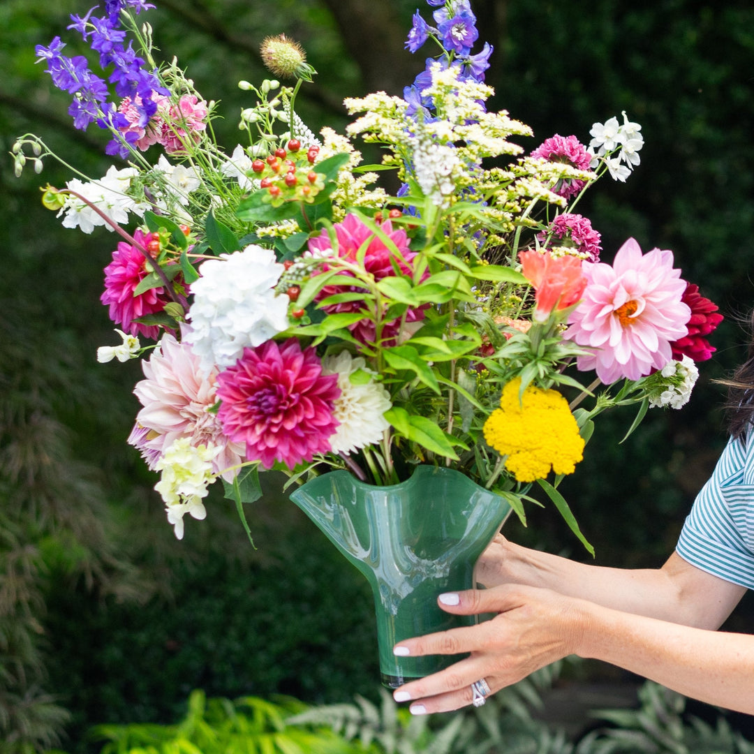 Our Lettuce Leaf Vase sold out just days after its initial launch. Perfect for a larger, central arrangement, this piece is a total show-stopper. Like all of our glassware, this vase is made with mouth-blown, recycled glass.