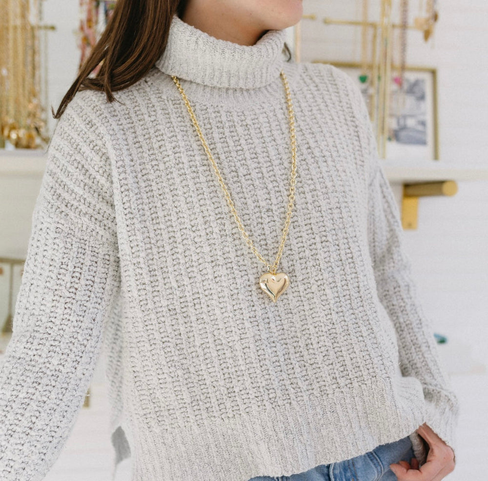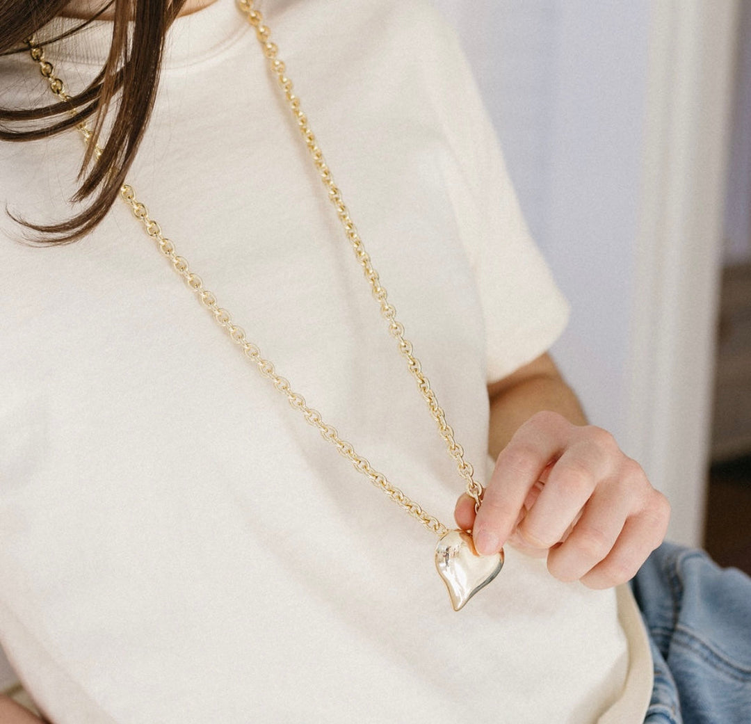This long puffy heart necklace is inspired by our favorite heart charm and necklace with a heart charm and the meaning being the symbol - it's a daily reminder to love yourself and share that love with the world. The charm hangs on a beautifully unique long gold chain , adding a trendy twist to your everyday look. Whether you’re dressing up or keeping it casual, this necklace is a stylish way to spread love and kindness wherever you go!