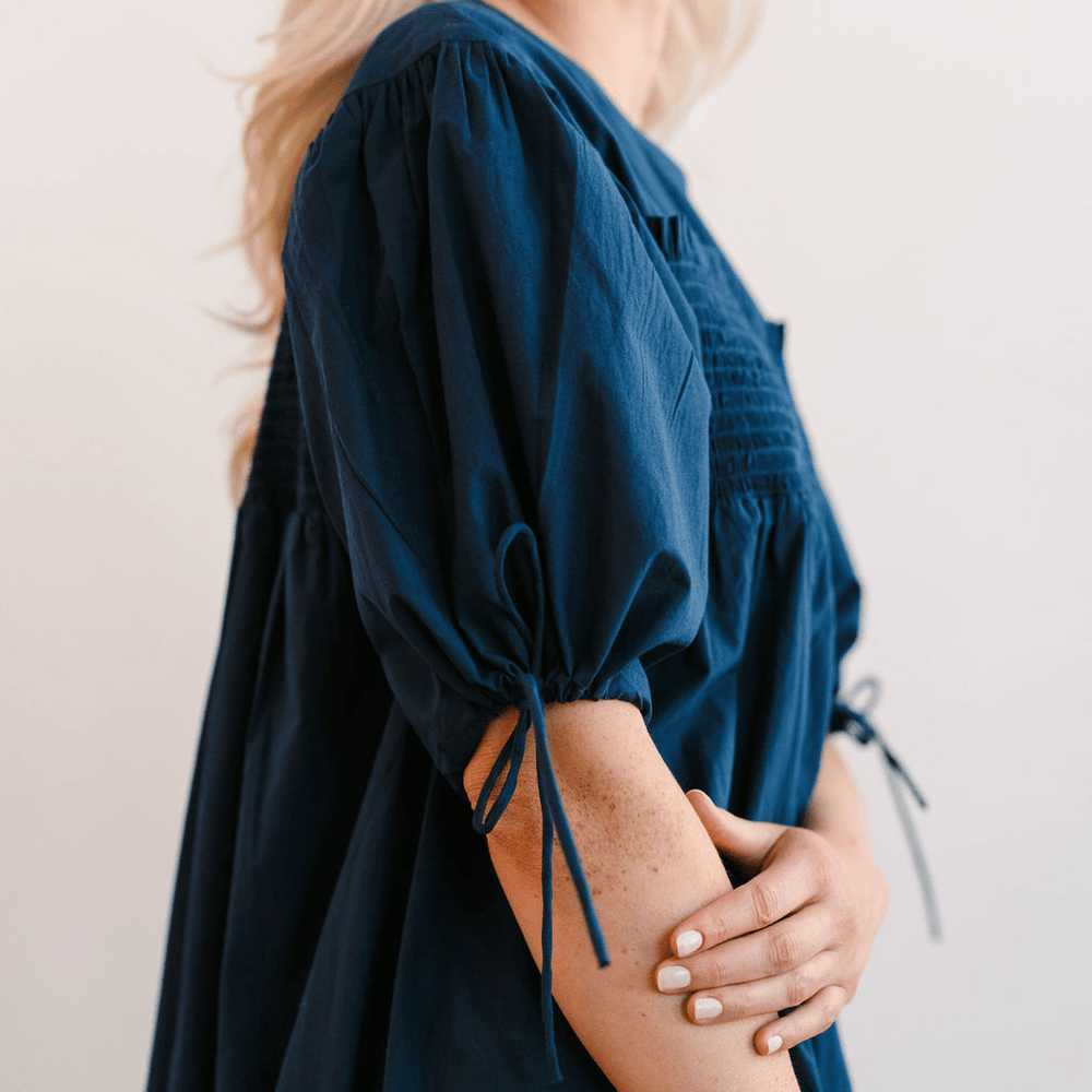 Introducing the Navy Katrin Dress, your go-to for fall fun! This chic new style features a smocked neckline and adjustable bubble sleeves with playful ties. In classic navy, it's the perfect blend of elegance and whimsy for your autumn wardrobe.