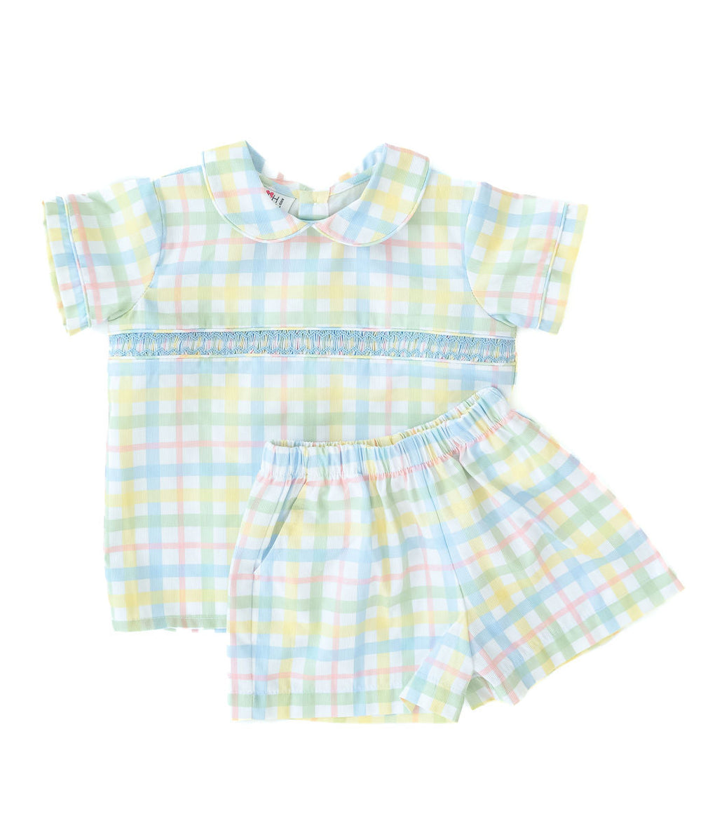 The Pastel Smocked Easter Plaid Shirt and Short Set for toddlers and young boys features subtle smocked detailing on the shirt, paired with a soft pastel plaid fabric for a classic, heirloom-quality design. With its crisp collar and traditional Southern style, this set is perfect for Easter, spring celebrations, and special occasions. Crafted from a comfortable blend of 65% polyester and 35% cotton, it’s available in sizes 12M to 6.