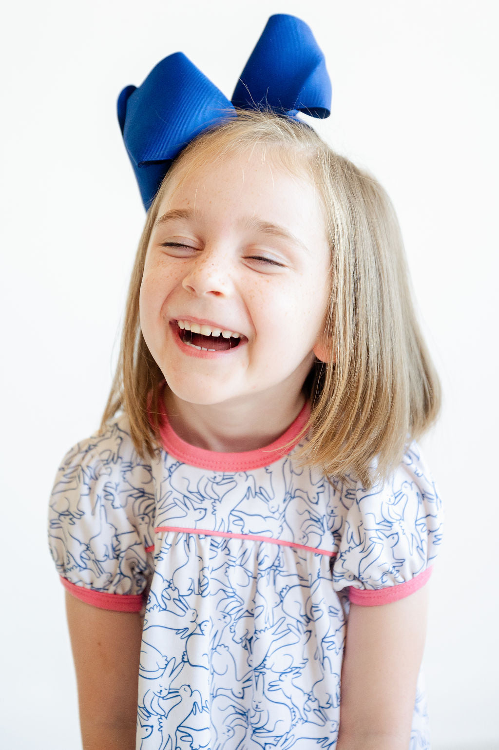 The Playful Bunnies Pima Dress features a whimsical bunny print with white bunnies outlined in blue and accented with pink piping. Made from 100% pima cotton, it’s soft and comfortable for all-day wear. This dress is perfect for playtime, casual outings, and spring occasions like Easter. Available in sizes 12M to 8 for toddlers and young girls.