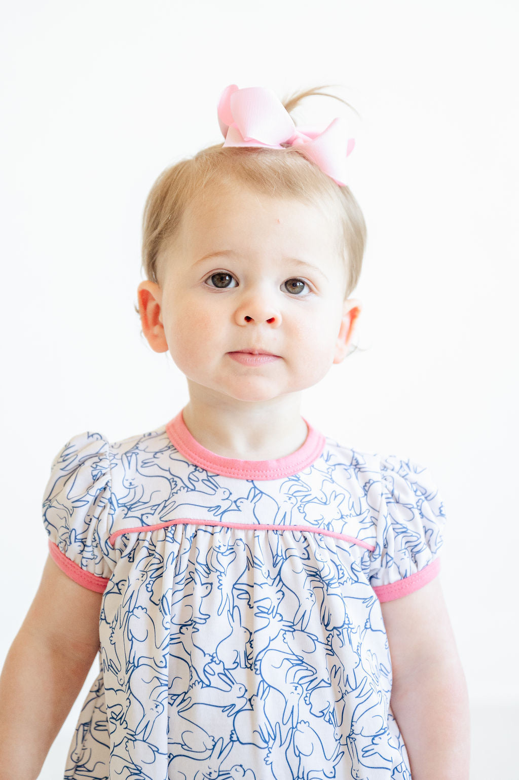 The Playful Bunnies Pima Bubble features an adorable bunny print with white bunnies outlined in blue and accented with pink piping. Made from 100% pima cotton, it’s soft and comfortable for your little one all day long. Perfect for play, casual outings, and Easter or springtime events, this bubble is an ideal choice for babies and toddler girls. Available in sizes NB to 2T.