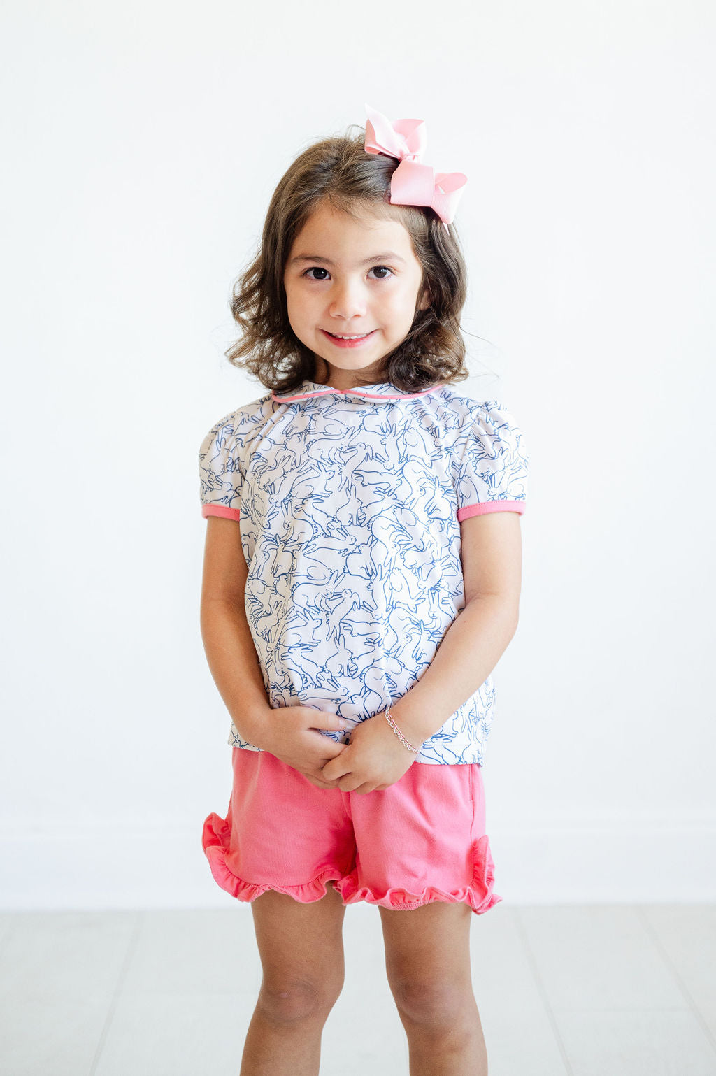 The Playful Bunnies Pima Play Set features a fun bunny print with white bunnies outlined in blue and pink piping, paired with matching pink shorts. Crafted from 100% pima cotton, it provides ultimate softness and comfort. The option to add a monogram adds a special touch, making it a great gift or perfect for personalizing the set. Available in sizes 12M to 6.