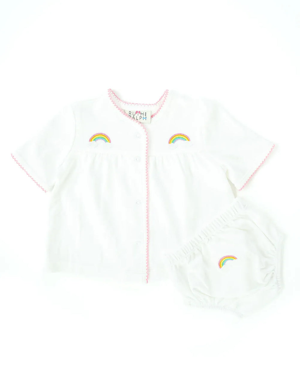 The Rainbows Layette Set is a sweet choice for welcoming your bundle of joy into the world. The hand embroidered rainbows are a beautiful addition to your baby's wardrobe. Crafted for both style and comfort, it's perfect for cuddle time with your new baby.
