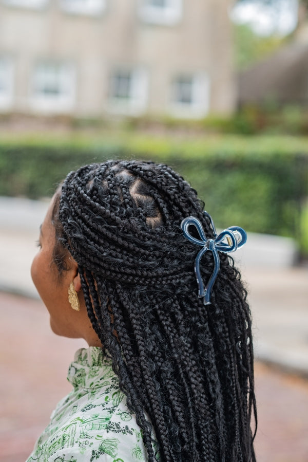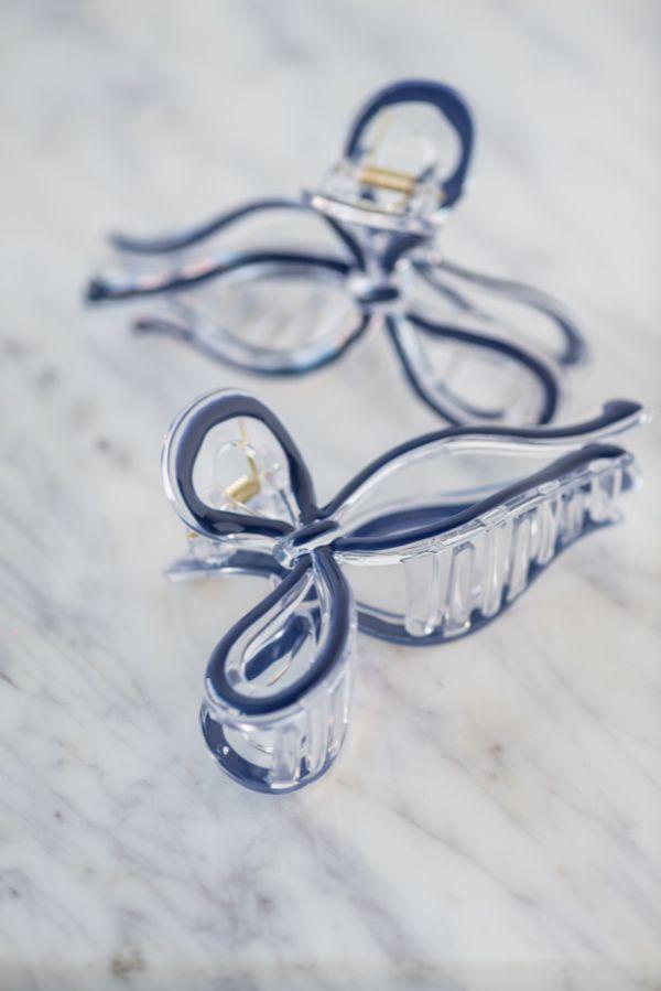 The Lacy Bow Claw Clip in navy blue is equally functional and cute. This navy jelly clip is equally functional and chic. This navy jelly clip is perfect to keep your hair out of your face while keeping it cute. Never leave the house without it! This item measures 2.5" x 5". This listing is for one clip.
