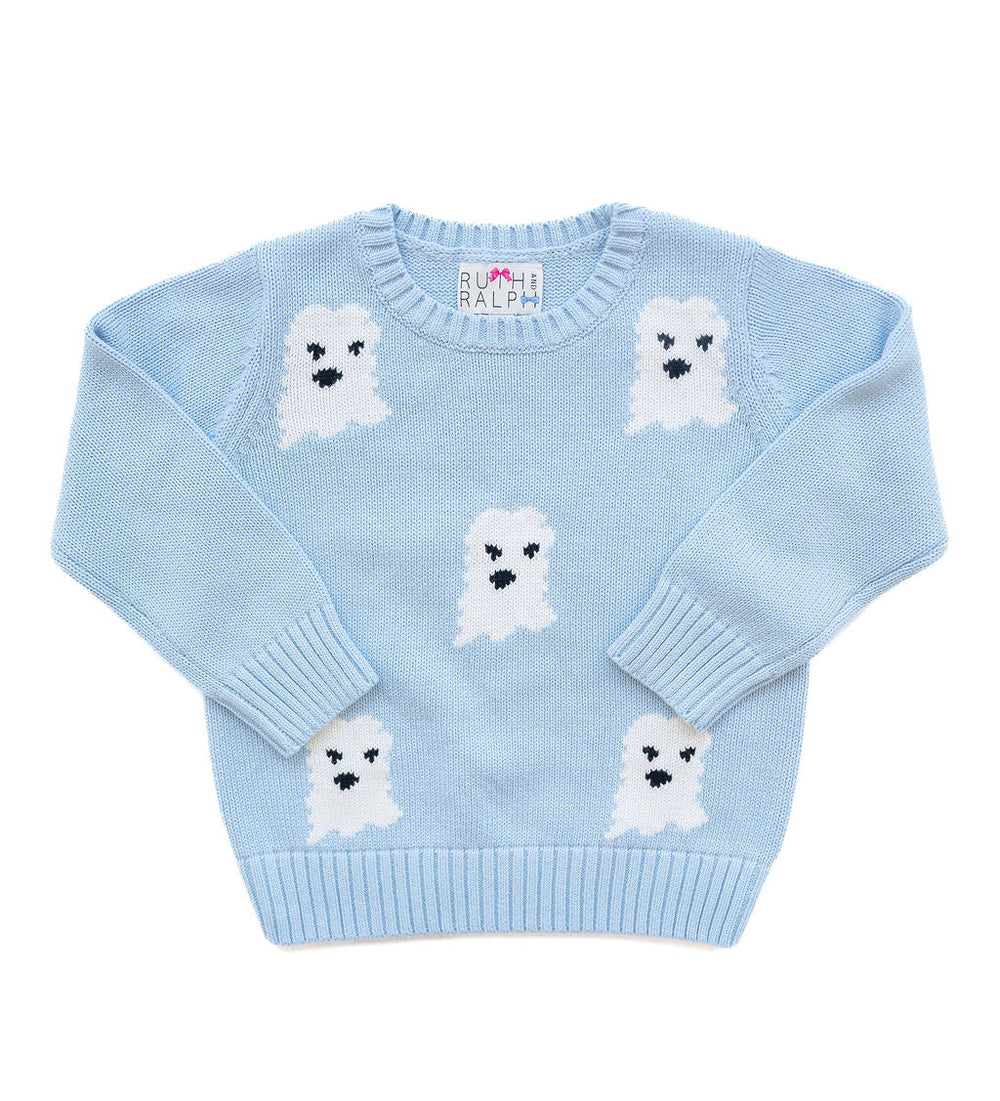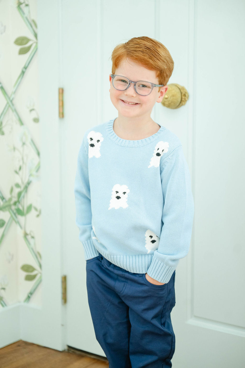 Your little boy’s new favorite Halloween sweater is here — our soft Blue Ghost Sweater! Covered in playful white ghosts, this cozy knit is perfect for pumpkin patch visits, fall festivals, Halloween celebrations, and all his seasonal events. The classic crewneck style makes it easy to layer over shirts or tees for a fun and festive look.