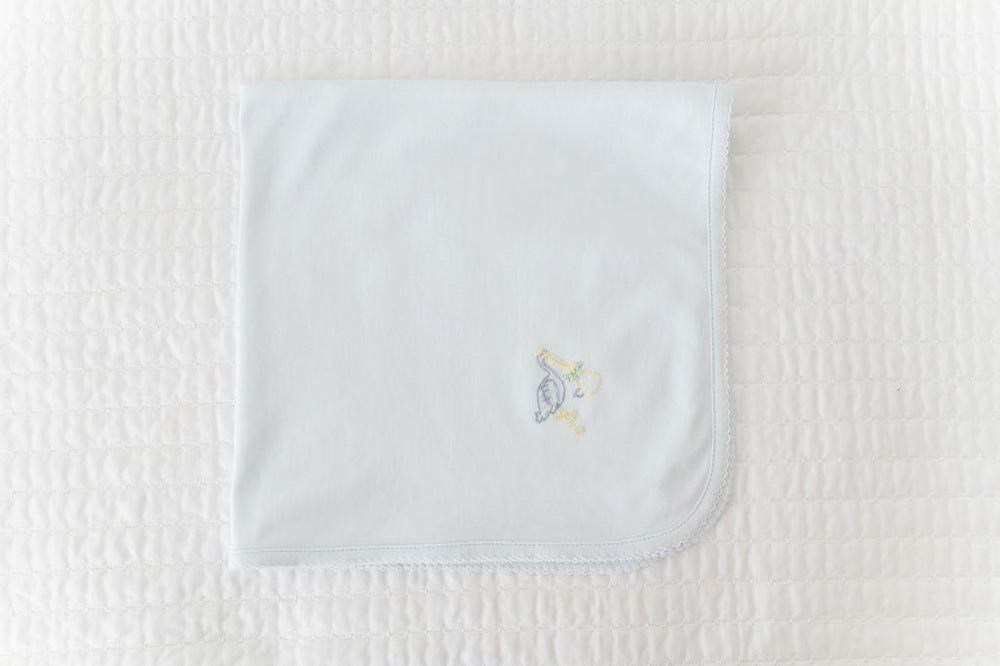 Nestle your precious newborn in comfort and classic charm with our Blue Stork Receiving Blanket. This luxuriously soft blanket features a sweet stork design. Perfect for swaddling your little one or providing warmth during cozy cuddles, it's a cherished keepsake for those precious newborn moments.
