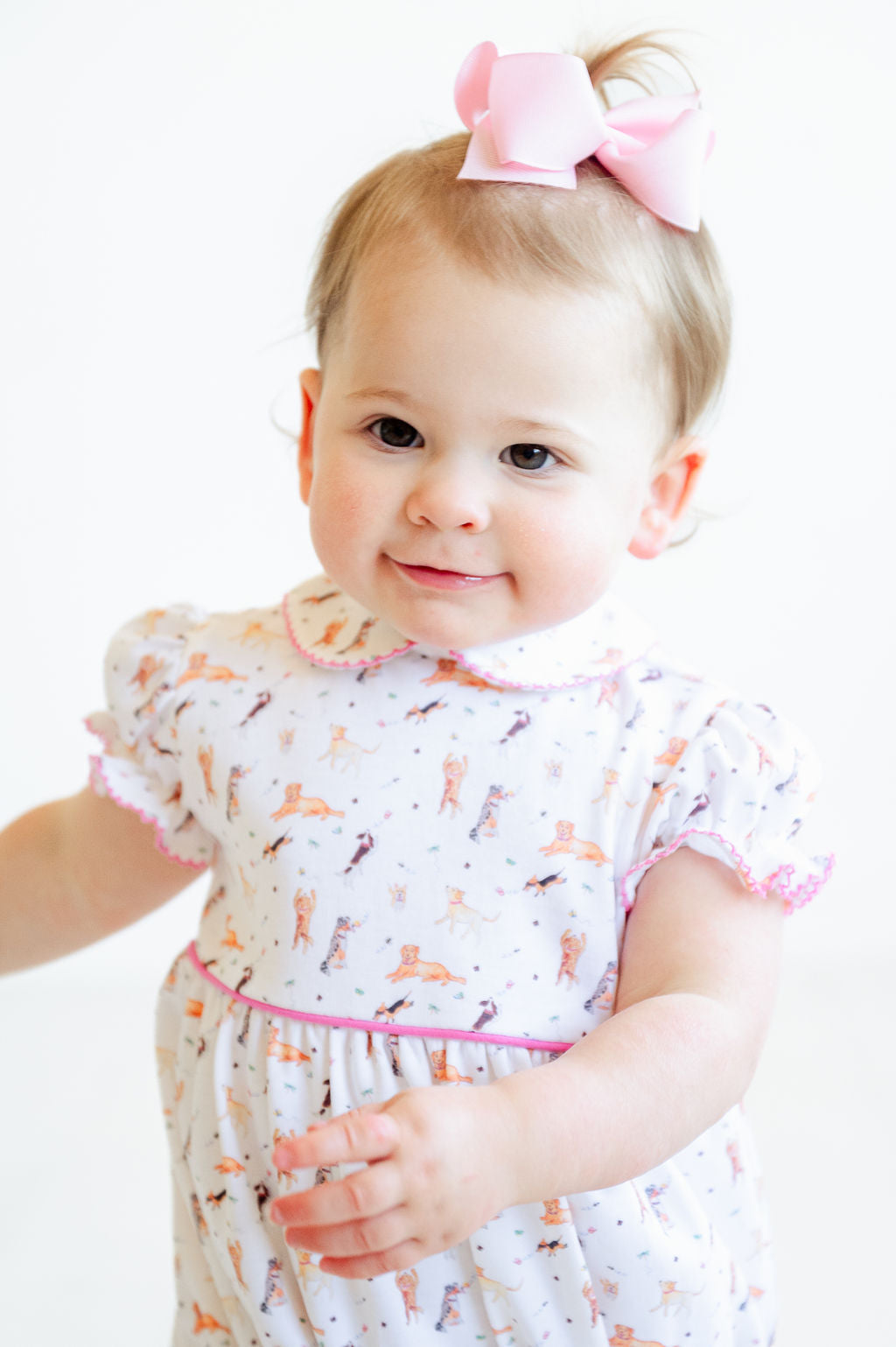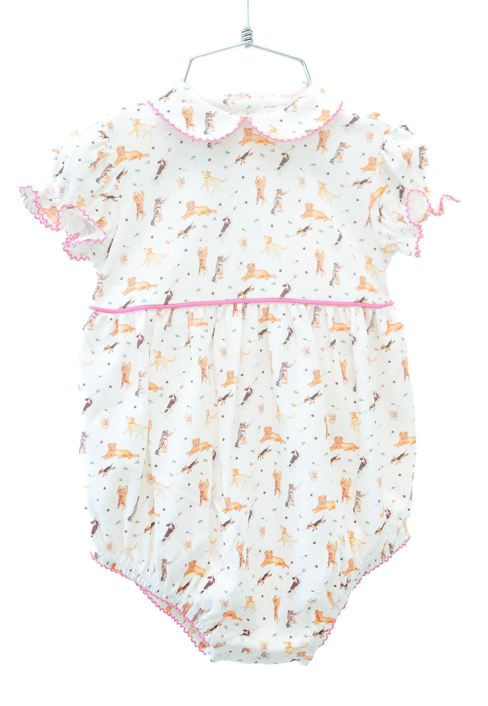 The Pima Puppy Bubble for girls is the perfect blend of playful and sweet. With an all-over puppy print on a crisp white background, this bubble features pink piping and a classic Peter Pan collar. Made from 100% pima cotton, it’s soft, breathable, and ideal for spring. Available in sizes NB to 2T, it’s designed for babies and toddler girls. The bubble runs true to size, but note it may shrink if dried in the dryer.