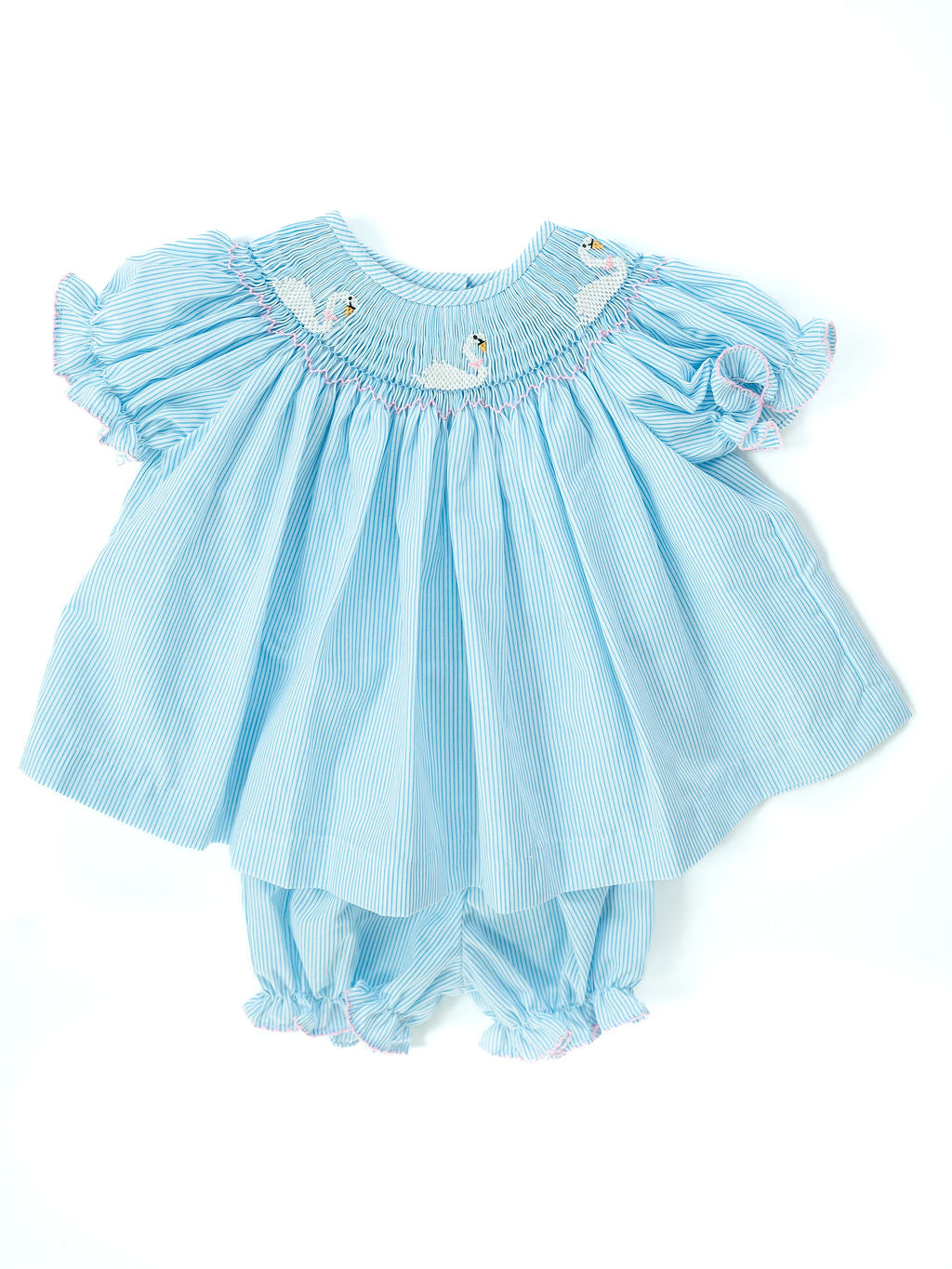 - Hand-smocked swans with pink bows
