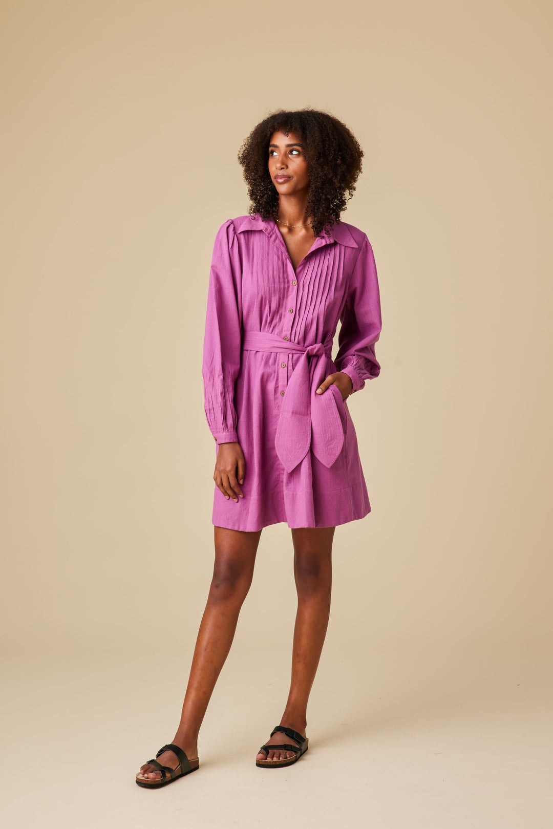 A structured collar and delicate pintuck pleats along the front add a tailored touch, balancing the fluidity of the fabric. The full sleeves, finished with gathered cuffs, create soft volume, while the button-down front allows for versatile styling—wear it open as a tunic or buttoned up for a polished look. A detachable belt with intricate stitch details cinches the waist for a refined silhouette or can be removed for a relaxed fit. And yes, it has pockets, because practicality is always in style.
