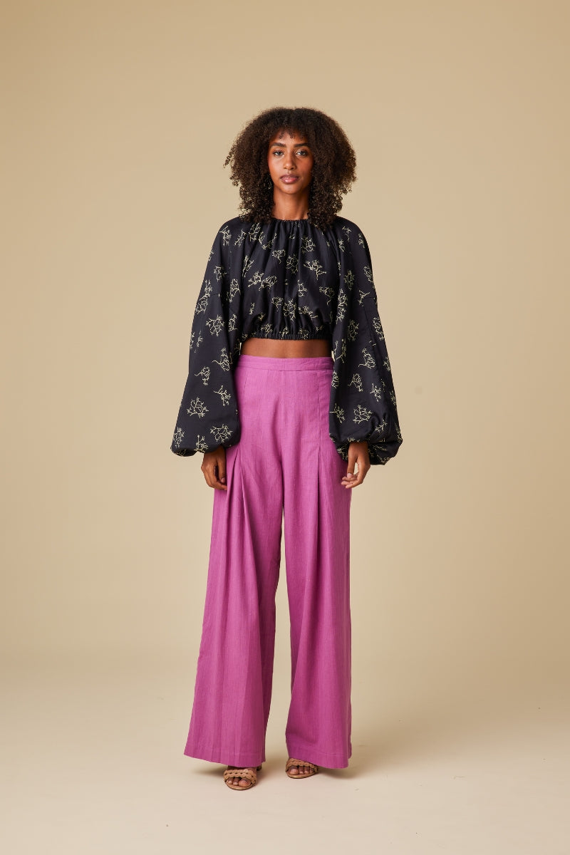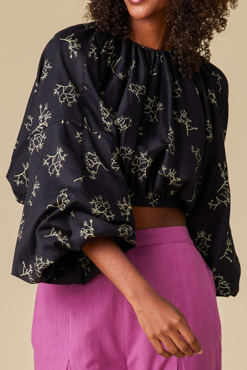 The Clara Top is a statement piece designed for effortless charm and versatility. This cropped bubble top features a relaxed, voluminous silhouette, paired with full-length, voluminous sleeves finished with elasticated cuffs for added detail. The elasticated hem gives the top its signature "bubble" shape, sitting comfortably at the waist.