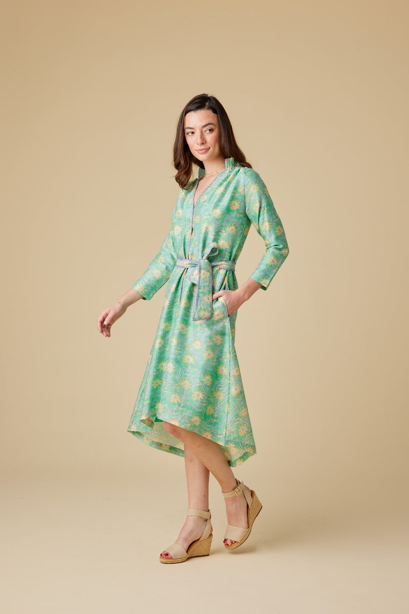 The Esme Dress combines effortless sophistication with thoughtful design details, making it a standout piece for any occasion. This raglan-sleeve shirt dress features a front button placket with intricate blanket stitch embroidery and ruching details on the collar for a refined, feminine touch. The high-low hemline adds a modern twist to its timeless silhouette, while a removable belt with hand-embroidered blanket stitch accents allows for versatile styling.