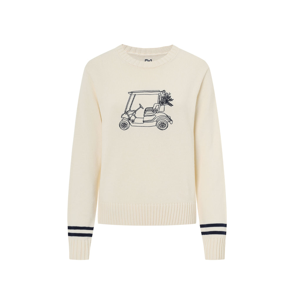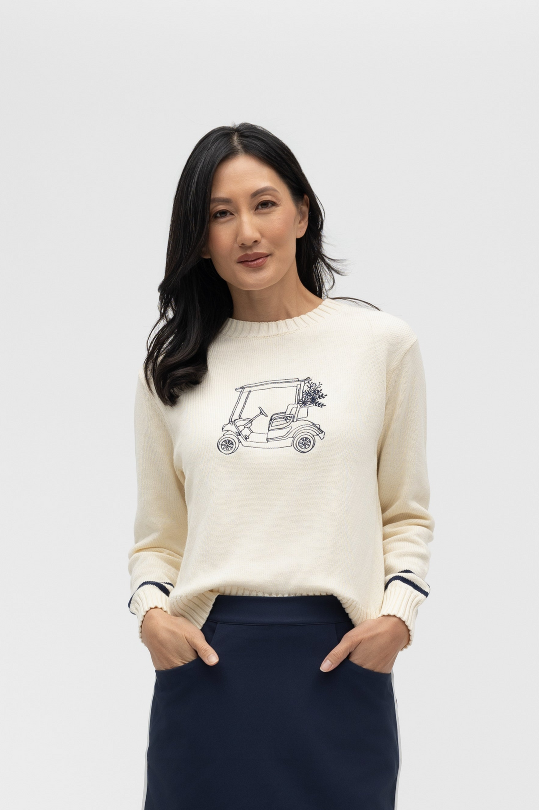 This crew neck 100% cotton sweater is perfect for a cool afternoon or for over the shoulders as a styling piece. Our signature golf cart is embroidered on the front with navy varsity hit stripes on the sleeves.