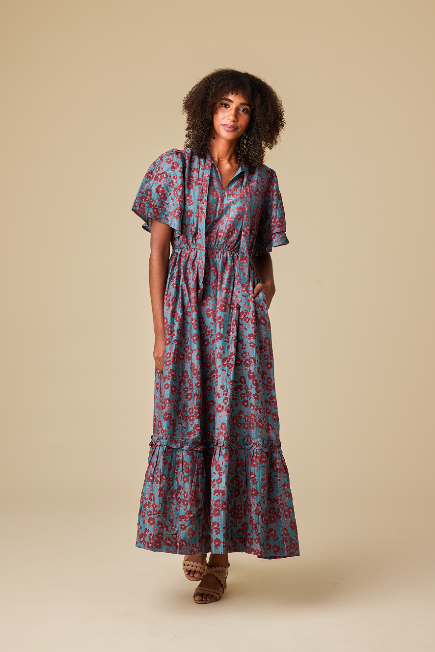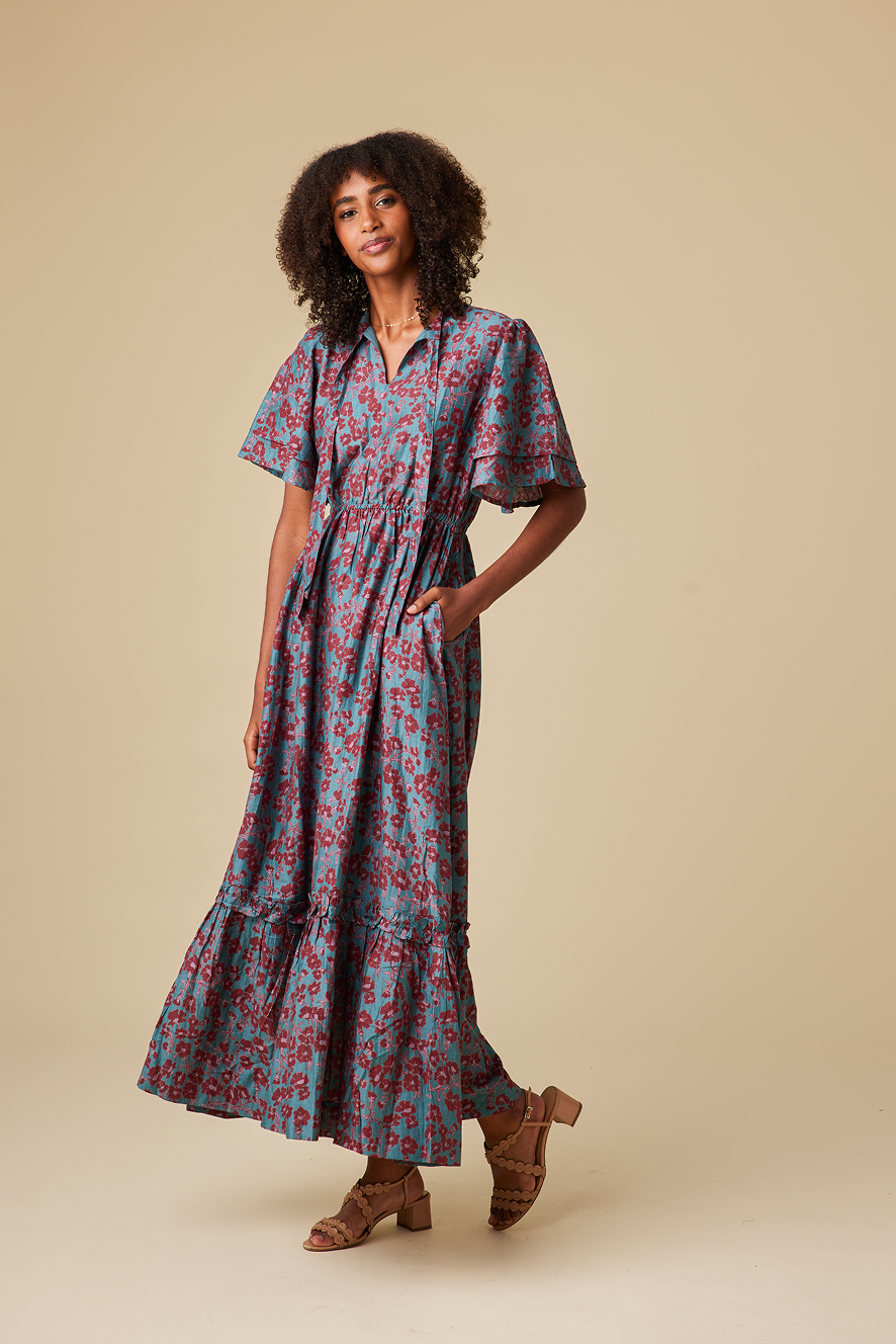 The elasticized waist softly defines the silhouette, while the delicate tie detail at the neckline adds a romantic and adjustable element, allowing for a customizable fit. Flutter sleeves enhance its airy movement, and the tiered maxi skirt brings a touch of whimsy. And, as always, functional side pockets blend practicality with effortless style.