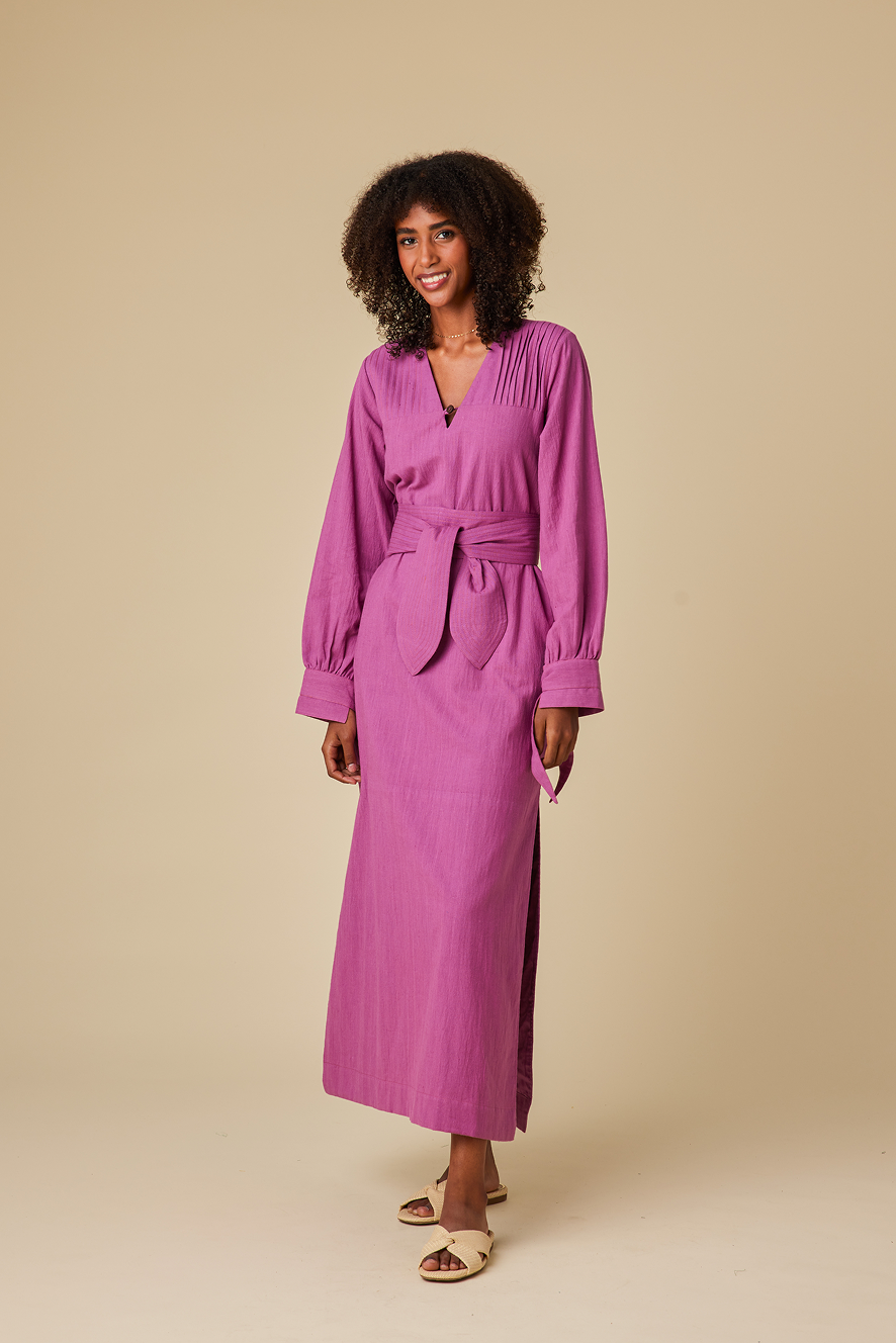 The Sirocco Maxi is where timeless elegance meets artisanal craftsmanship. Made from 100% hand-spun, hand-woven, and hand-dyed khadi, this dress is a tribute to slow fashion and heritage textiles. Its effortless silhouette moves with you, offering both comfort and quiet sophistication.