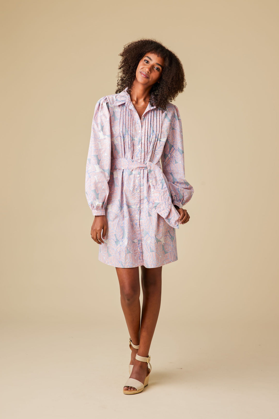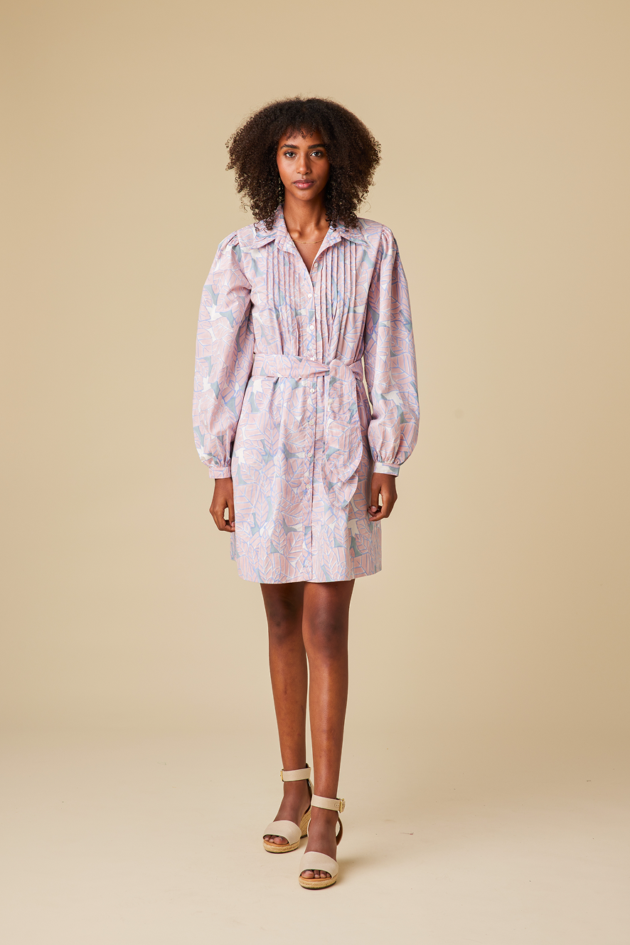 A crisp yet breezy mini dress, the Solana Dress blends structure with soft detailing, making it a versatile staple for both everyday wear and special occasions. The silhouette features a collared neckline with delicate ruching, pin-tucks at the bodice, and full-length voluminous sleeves with buttoned cuffs. Designed for effortless styling, it comes with a detachable belt for an optional cinched look. Functional side pockets add a practical touch, making it an easy go-to piece for any wardrobe.