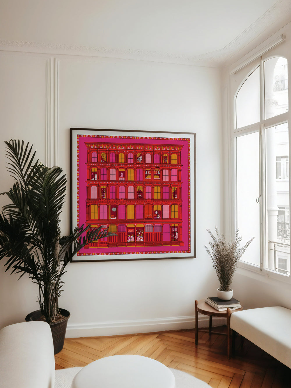 One apartment building, multiple stories: A french patisserie, chic poodle, ballet dancer… even Wells’s wedding cake is illuminated in one of this scarf’s many window scenes!